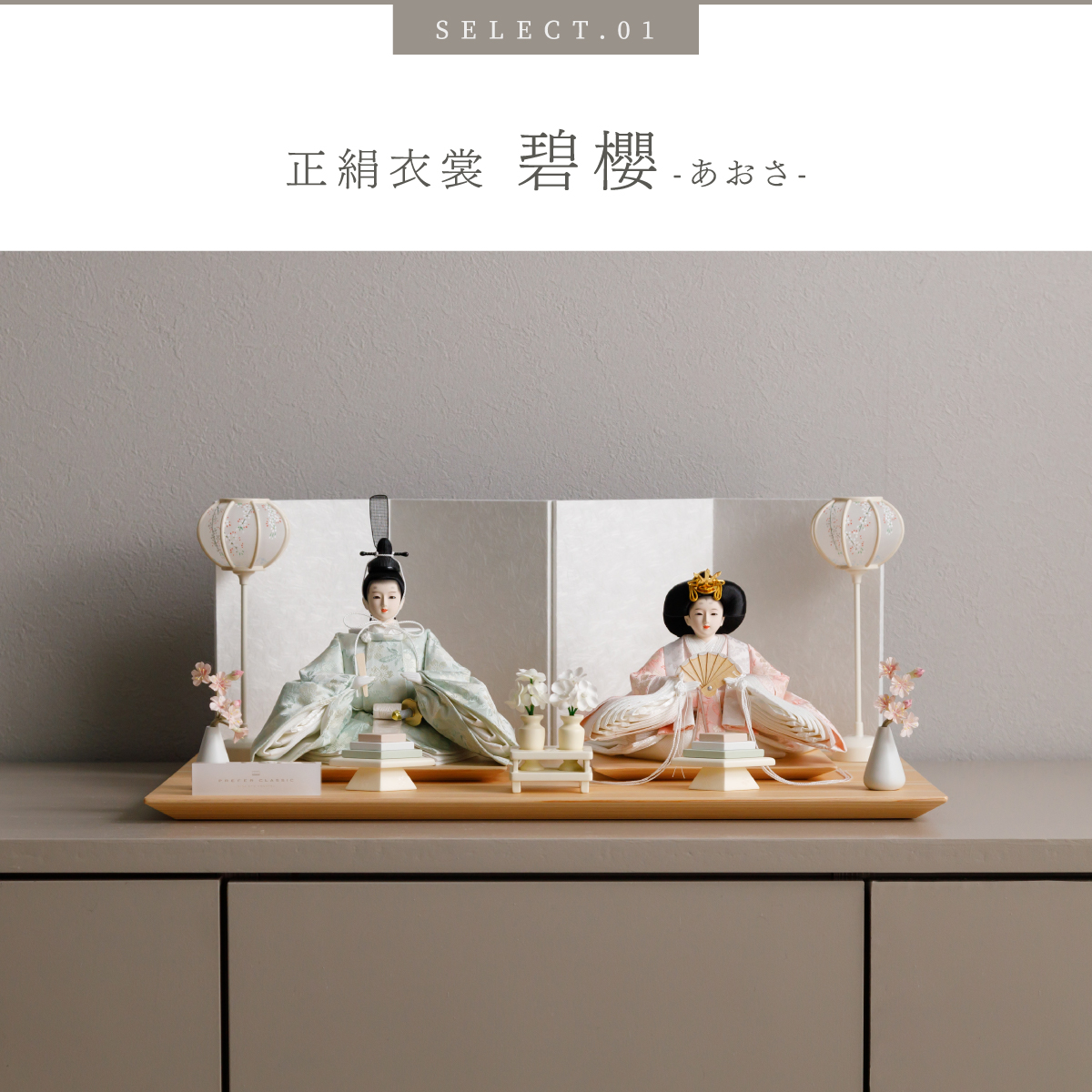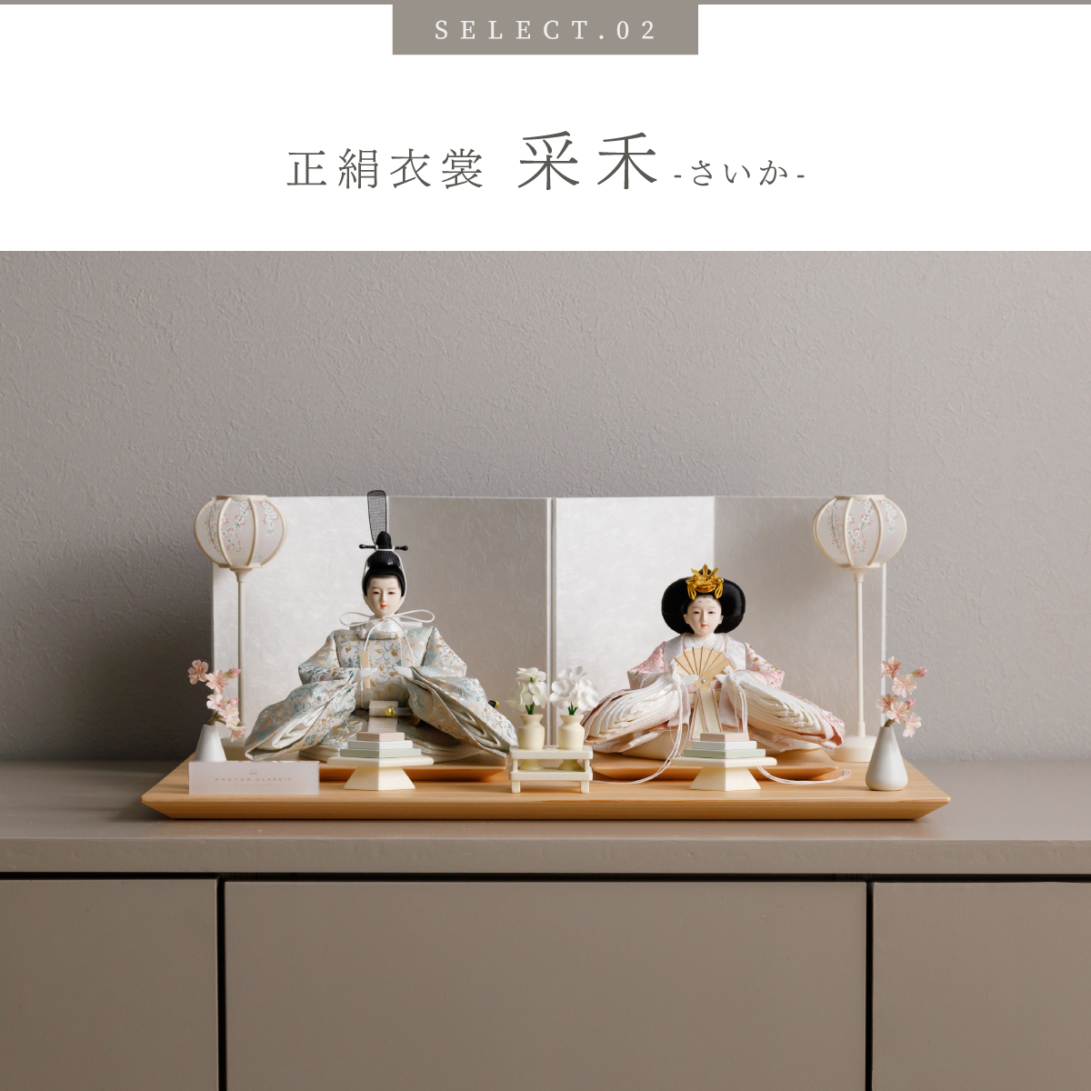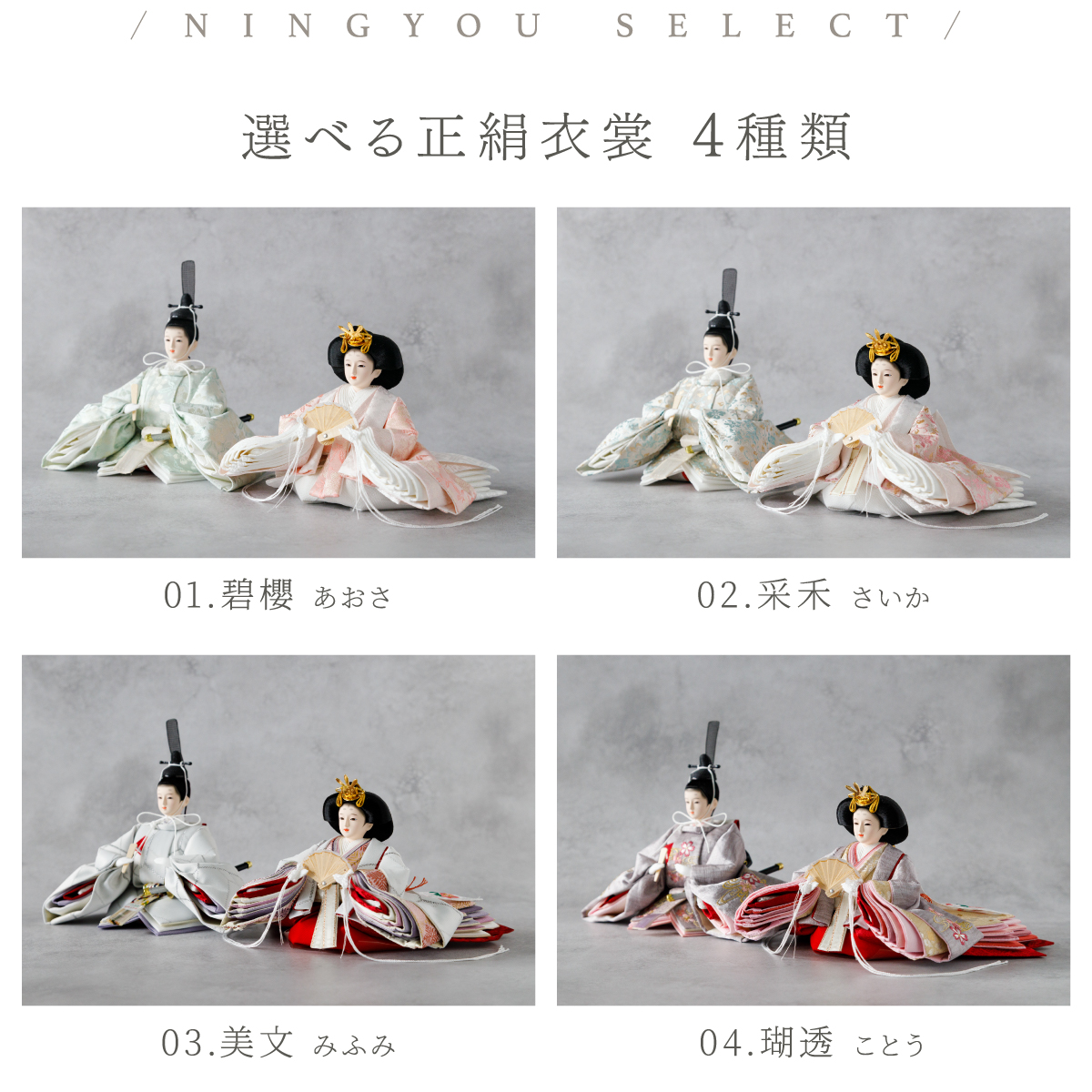PREFER CLASSIC ひな人形 [檜台 白屏風 平飾り お道具付 菱餅三方 雪洞 枝桜ピンク 人形極小サイズ 選べる正絹衣裳4種類 碧櫻 采禾 美文 瑚透]