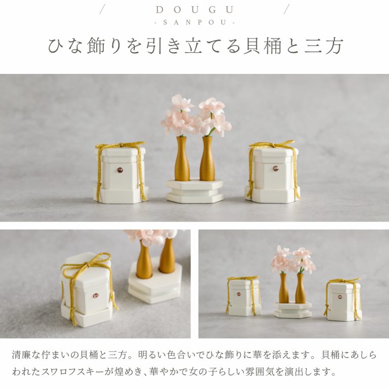 TOP > 雛人形 > サイズ奥行 > PREFER CLASSIC ひな人形 [檜台 白屏風 平飾り お道具付 貝桶三方 油灯 白梅 人形極小サイズ 選べる正絹衣裳4種類 碧櫻 采禾 美文 瑚透]
