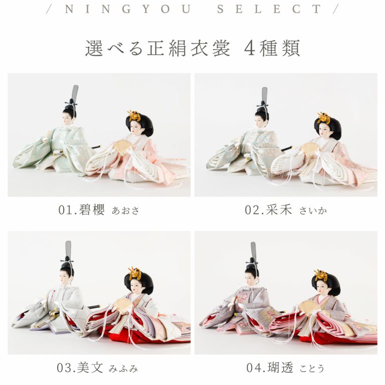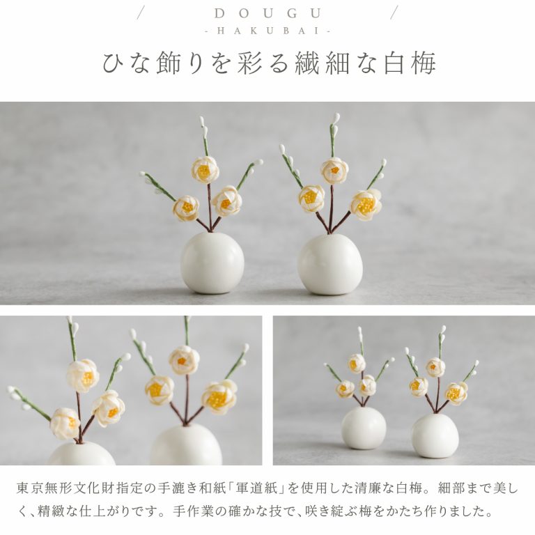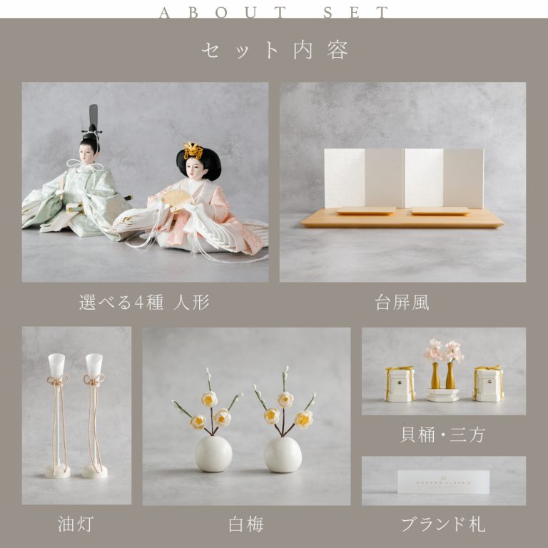 PREFER CLASSIC ひな人形 [檜台 白屏風 平飾り お道具付 貝桶三方 油灯 白梅 人形極小サイズ 選べる正絹衣裳4種類 碧櫻 采禾 美文 瑚透]