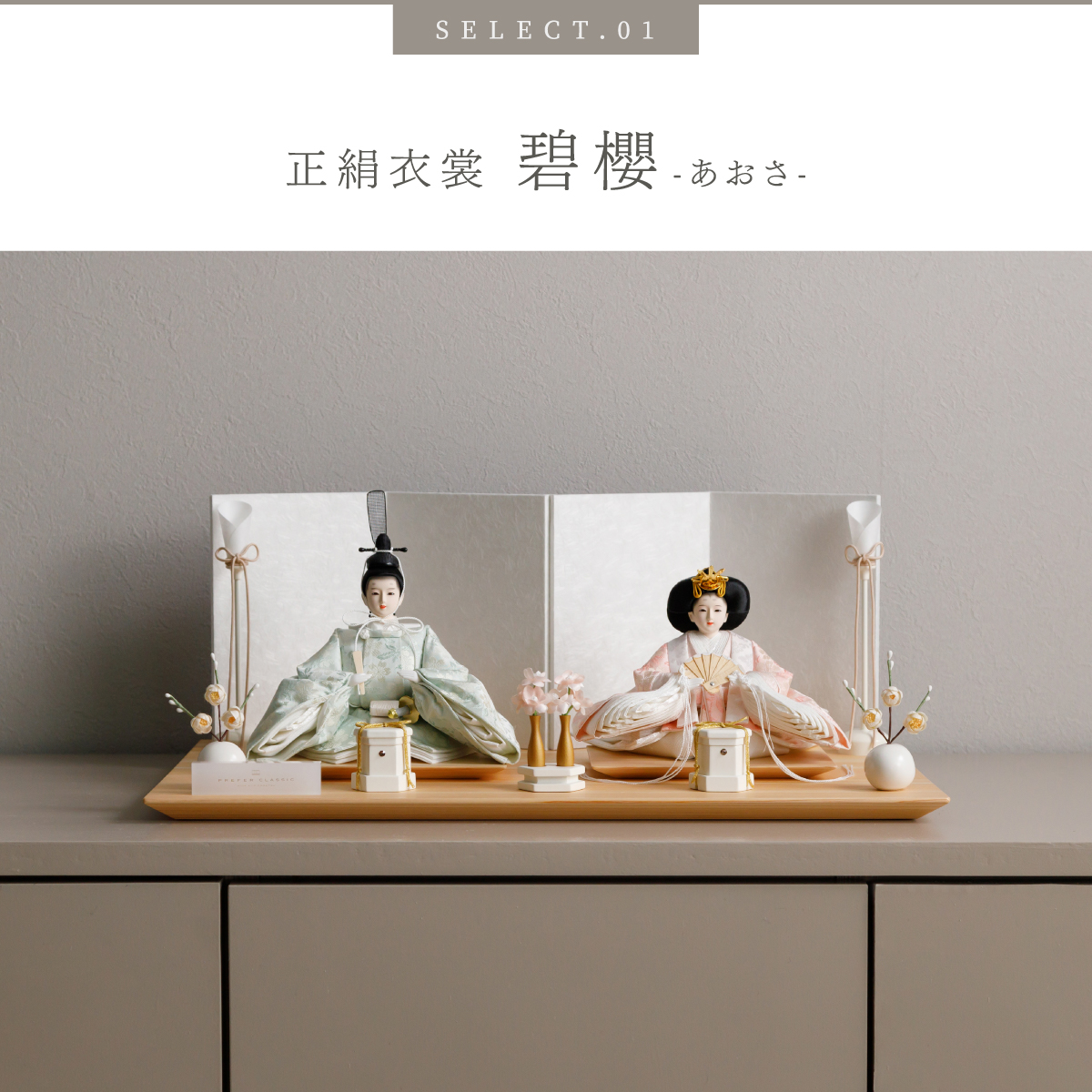 PREFER CLASSIC ひな人形 [檜台 白屏風 平飾り お道具付 貝桶三方 油灯 白梅 人形極小サイズ 選べる正絹衣裳4種類 碧櫻 采禾 美文 瑚透]
