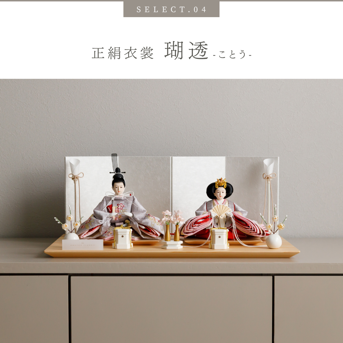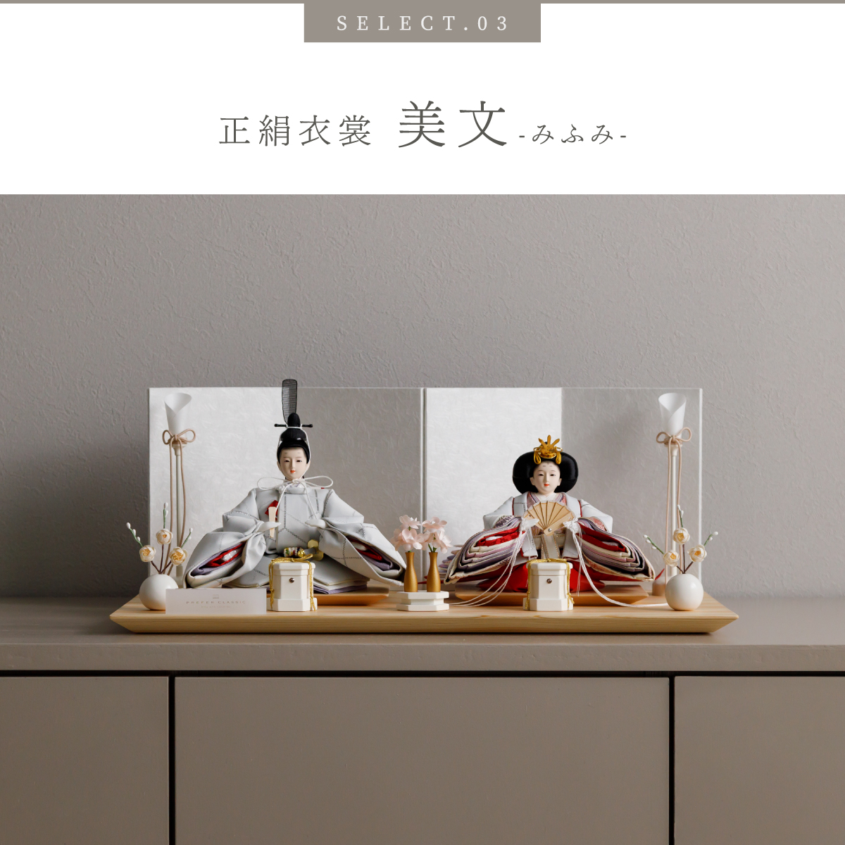 TOP > 雛人形 > サイズ奥行 > PREFER CLASSIC ひな人形 [檜台 白屏風 平飾り お道具付 貝桶三方 油灯 白梅 人形極小サイズ 選べる正絹衣裳4種類 碧櫻 采禾 美文 瑚透]
