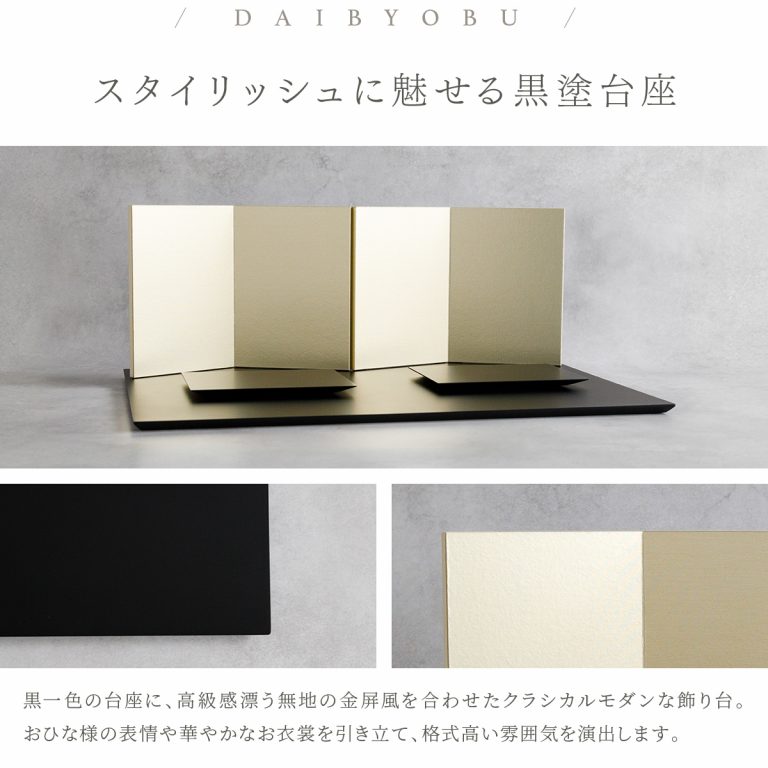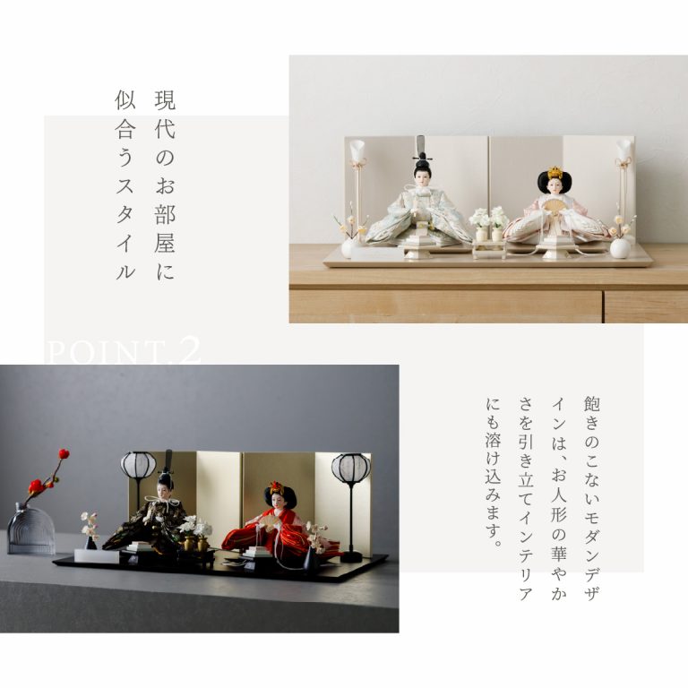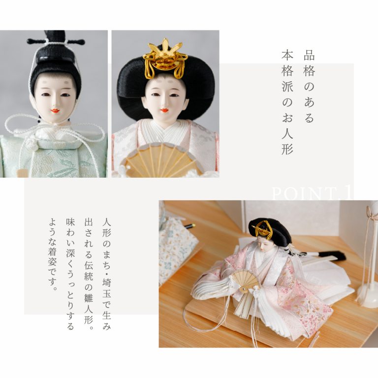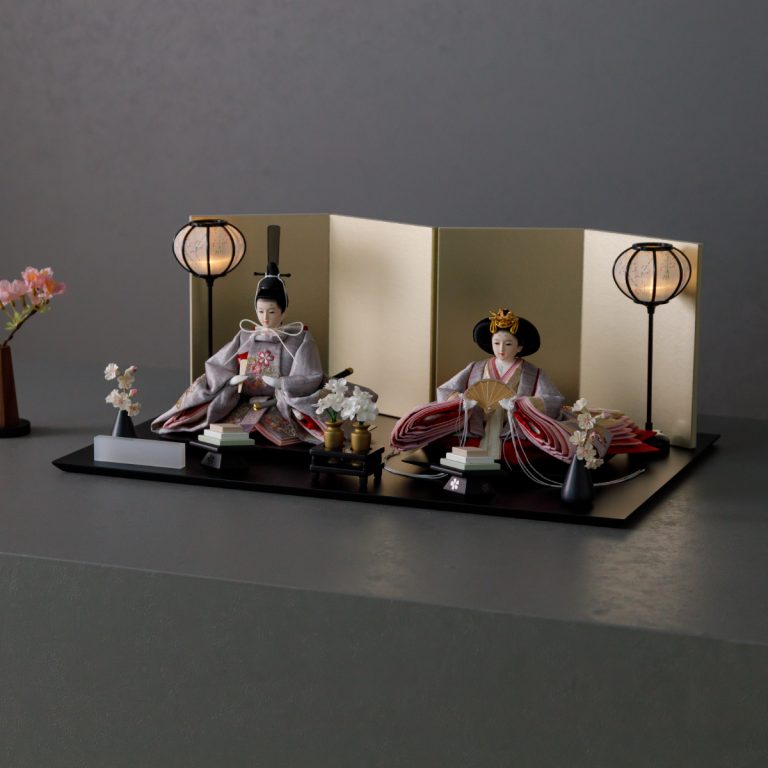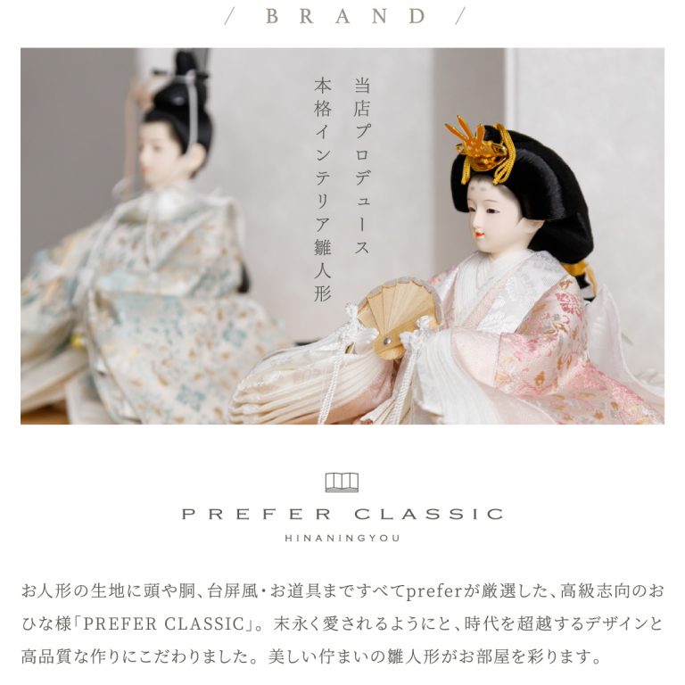 人形のお顔、飾り台、お道具まですべてにこだわり抜いて制作した、preferプロデュースの雛人形。熟練の職人たちがその技術を惜しみなく注いだ、本格派かつ高級志向のハイグレードなおひな様です。流行に左右されないシンプルモダンなスタイルのひな飾りは、時代を超えてどんな日の雛祭りにも華を添えます。衣裳着雛人形の美しい着姿を楽しめる親王飾り。かわいいお顔のお殿様とお姫様が優しく微笑みます。省スペースで楽しめる超コンパクトサイズ。存在感を放ちつつインテリアのようにお部屋に溶け込みます。高級感あふれる正絹生地のお衣裳は、おめでたい日の雰囲気をいっそう盛り上げてくれるでしょう。飾り台には主役のお人形が映える黒一色の台座を使用。華やかな金の四曲屏風と共に、ひな人形のお衣裳を引き立てます。組立て不要な平飾りタイプは設置もお手軽。繊細で美しいお道具もセットになり、華やかかつ豪華な雛飾りに仕上げました。可愛い雪洞はコードレスタイプです。初節句のお祝いやギフトにおすすめの、最高級の逸品です。