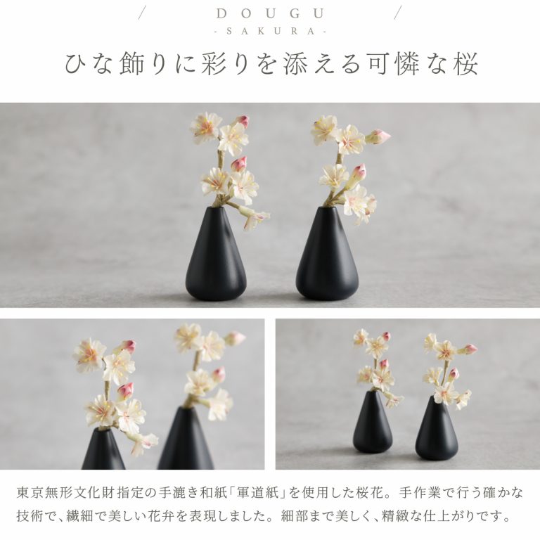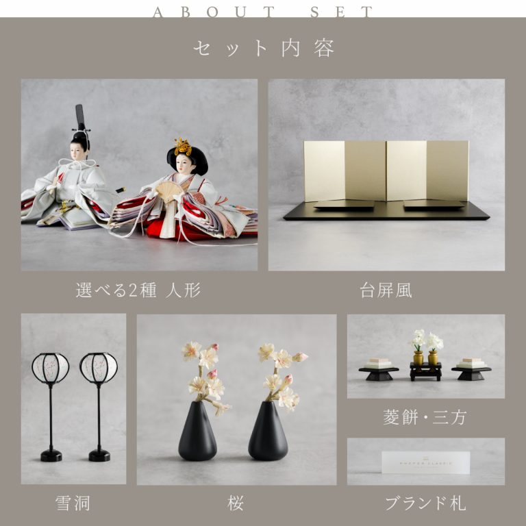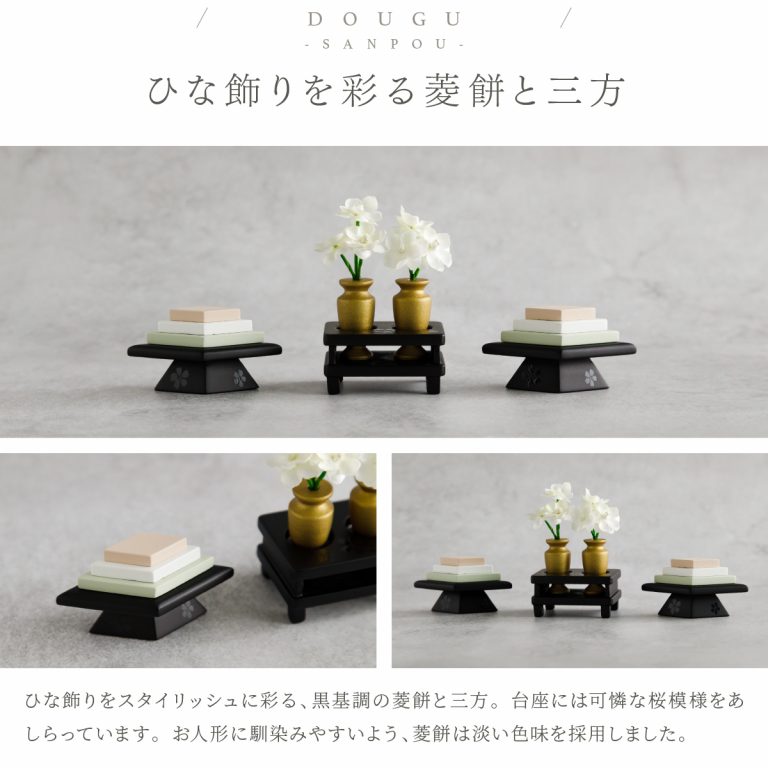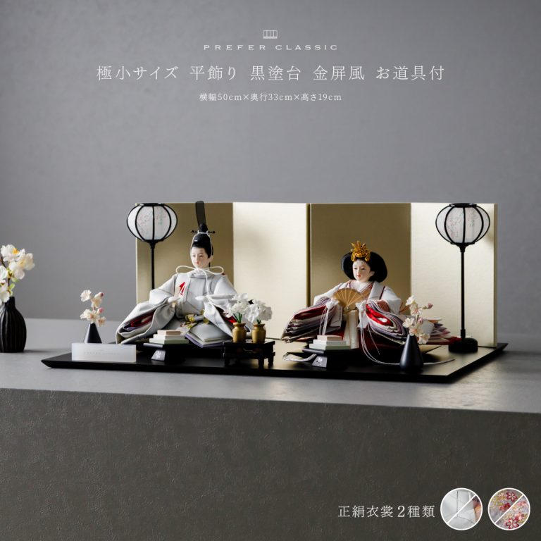 PREFER CLASSIC ひな人形 [黒塗台 金屏風 平飾り お道具付 枝桜白 菱餅三方 雪洞 人形極小サイズ 選べる正絹衣裳2種類 美文 瑚透]