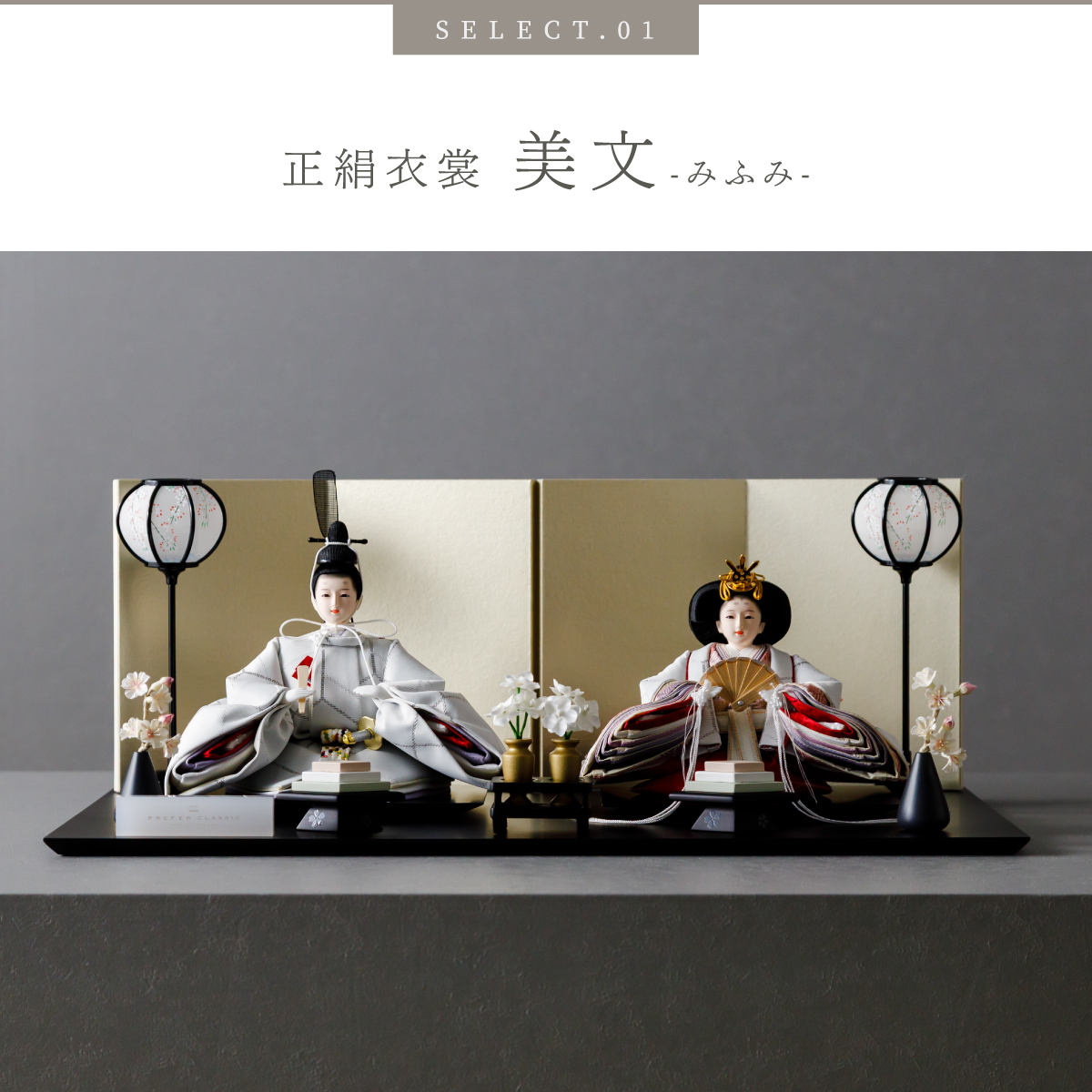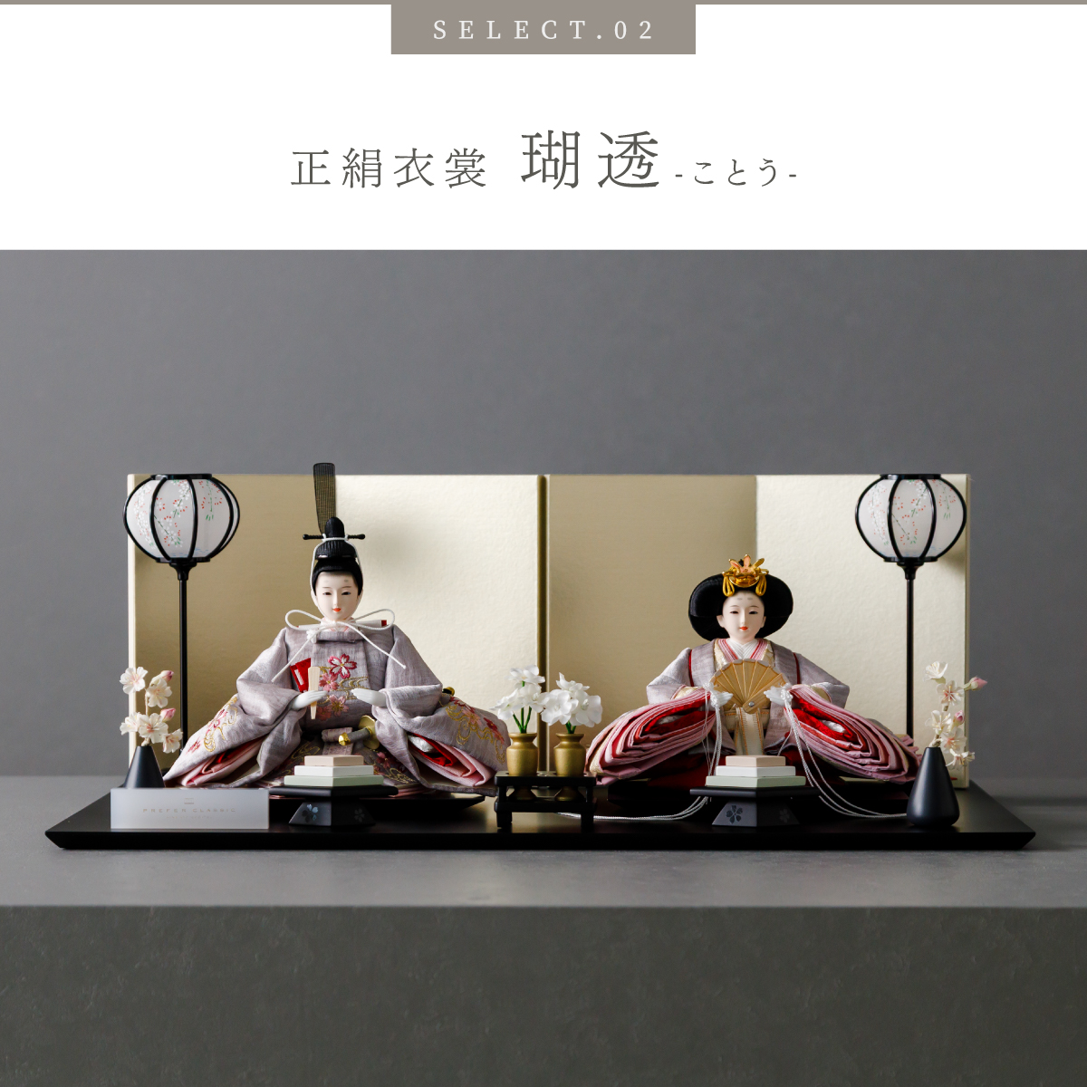 PREFER CLASSIC ひな人形 [黒塗台 金屏風 平飾り お道具付 枝桜白 菱餅三方 雪洞 人形極小サイズ 選べる正絹衣裳2種類 美文 瑚透]