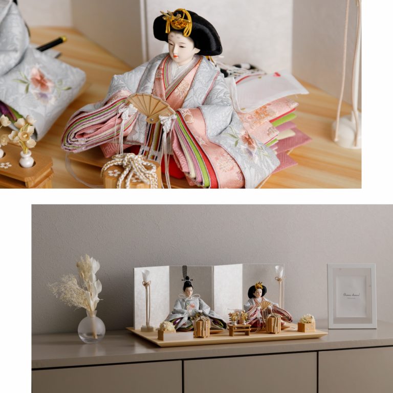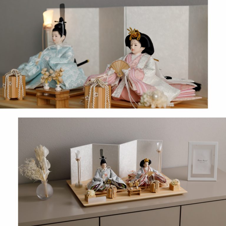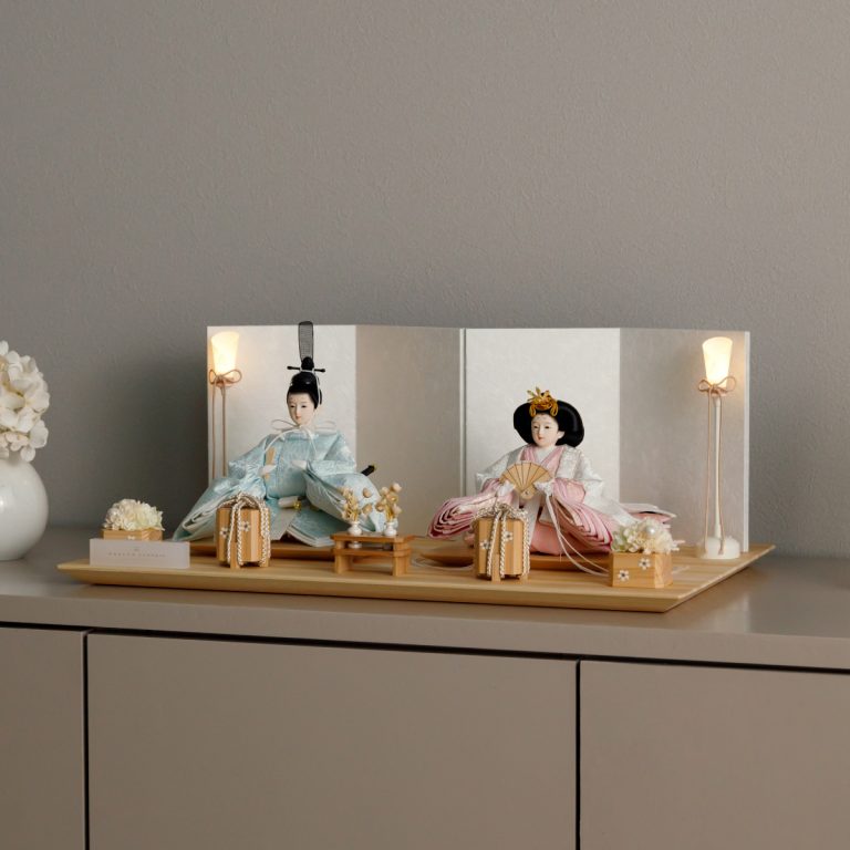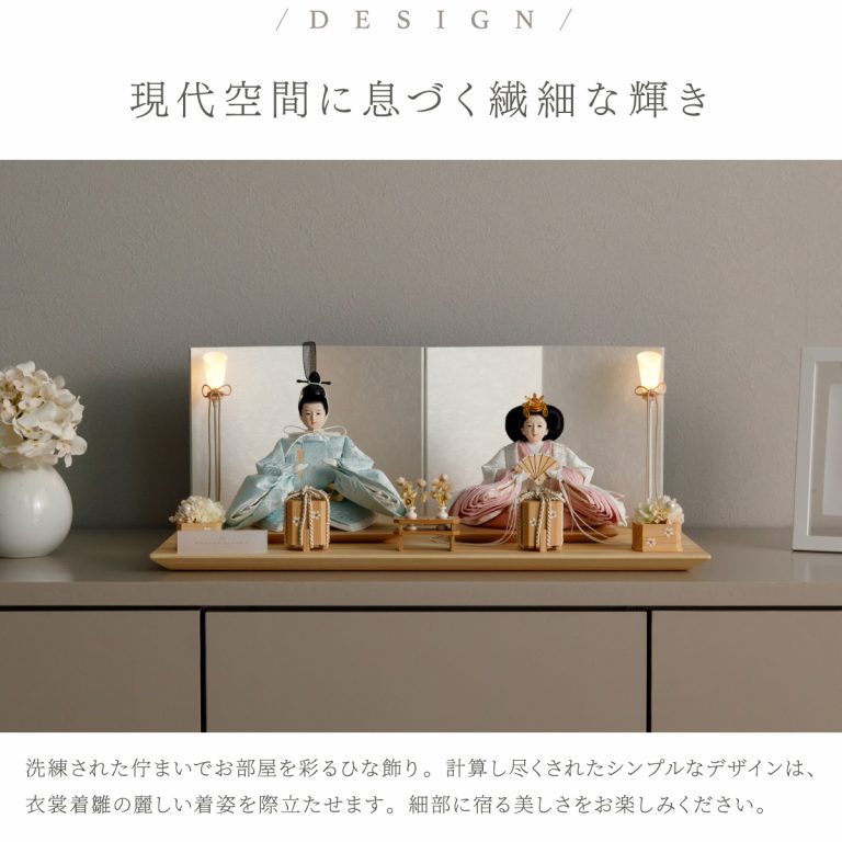 人形のお顔、飾り台、お道具まですべてにこだわり抜いて制作した、preferプロデュースの雛人形。熟練の職人たちがその技術を惜しみなく注いだ、本格派かつ高級志向のハイグレードなおひな様です。流行に左右されないシンプルモダンなスタイルのひな飾りは、時代を超えてどんな日の雛祭りにも華を添えます。衣裳着雛人形の美しい着姿を楽しめる親王飾り。かわいいお顔のお殿様とお姫様が優しく微笑みます。省スペースで楽しめる超コンパクトサイズ。存在感を放ちつつインテリアのようにお部屋に溶け込みます。美しく品のあるお衣裳は、おめでたい日の雰囲気をいっそう盛り上げてくれるでしょう。飾り台には肌目の美しい檜(ヒノキ)の台座を使用。趣深い白の四曲屏風と共に、ひな人形のお衣裳を引き立てます。組立て不要な平飾りタイプは設置もお手軽。繊細で美しいお道具もセットになり、華やかかつ豪華な雛飾りに仕上げました。雛人形を照らす可愛い油灯はコードレス式。女の子の初節句のお祝いやギフトにおすすめのおひな様です。
