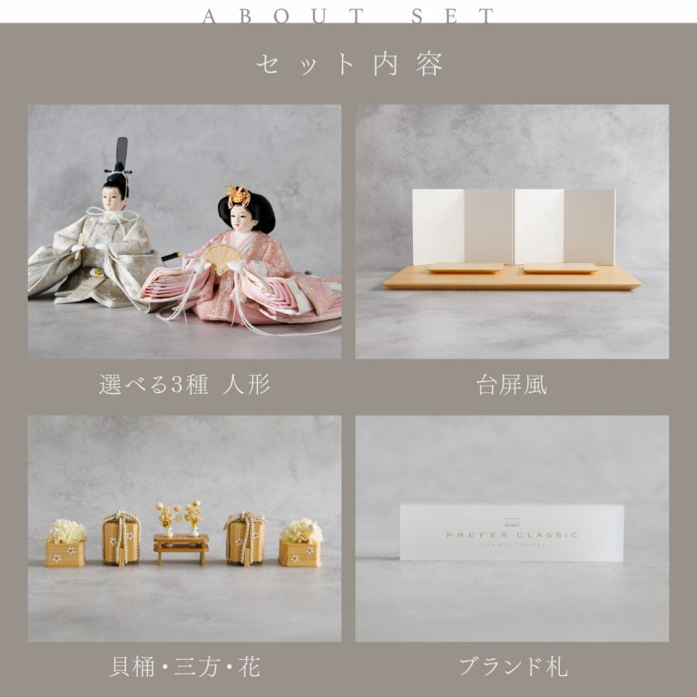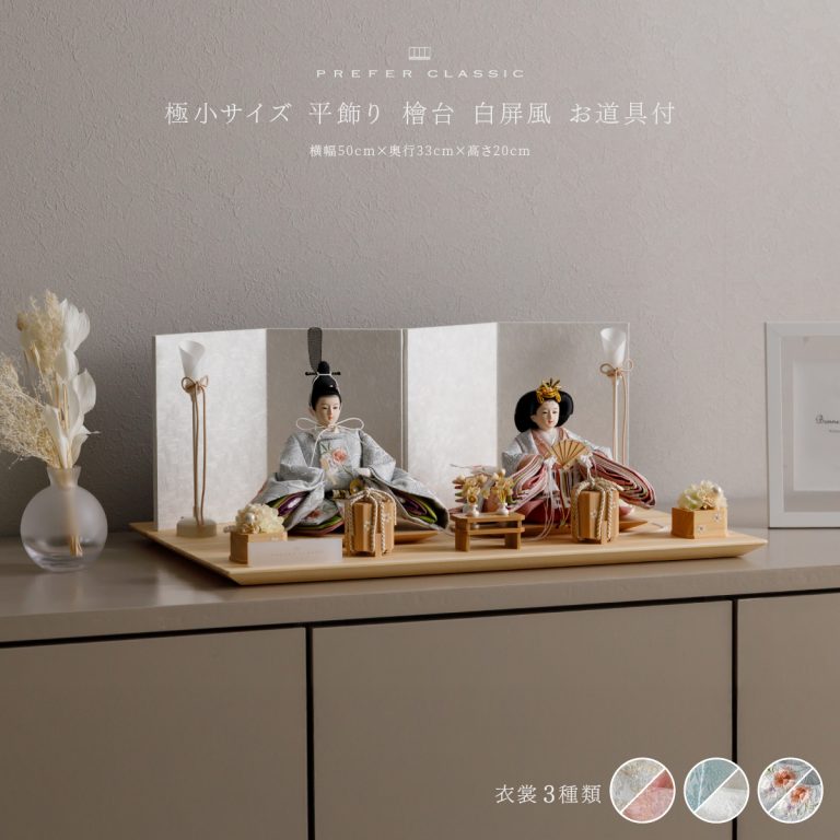 PREFER CLASSIC ひな人形 [檜台 白屏風 お道具付 貝桶花 油灯 人形極小サイズ 選べる衣裳3種類 帆南 白詩 篠桜]