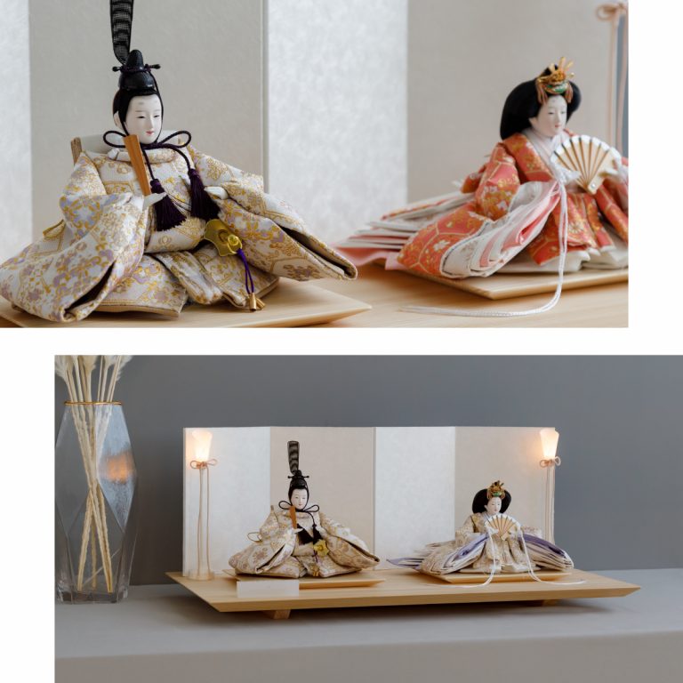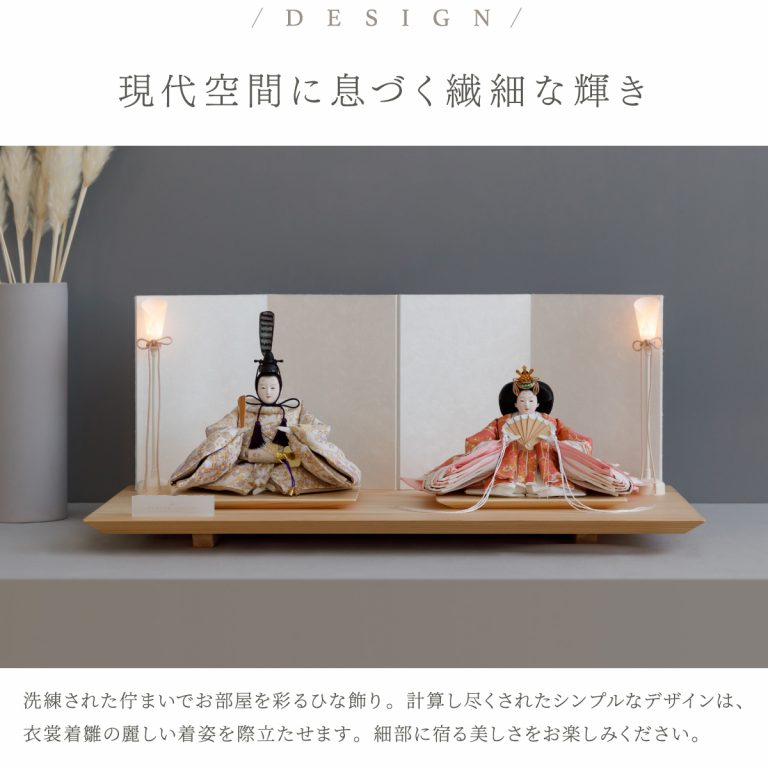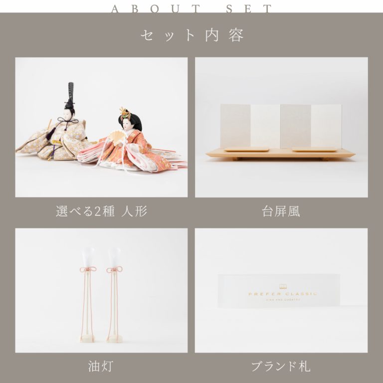 人形のお顔、飾り台、お道具まですべてにこだわり抜いて制作した、preferプロデュースの雛人形。熟練の職人たちがその技術を惜しみなく注いだ、本格派かつ高級志向のハイグレードなおひな様です。流行に左右されないシンプルモダンなスタイルのひな飾りは、時代を超えてどんな日の雛祭りにも華を添えます。衣裳着雛人形の美しい着姿を楽しめる親王飾り。かわいいお顔のお殿様とお姫様が優しく微笑みます。程よくコンパクトなサイズ感。存在感を放ちつつインテリアのようにお部屋に溶け込みます。煌めく金糸を用いた金襴衣裳は、おめでたい日の雰囲気をいっそう盛り上げてくれるでしょう。飾り台には肌目の美しい檜(ヒノキ)の台座を使用。趣深い白の四曲屏風と共に、ひな人形のお衣裳を引き立てます。組立て不要な平飾りタイプは設置もお手軽。あえてお道具を配さないシンプルなスタイルの雛飾りは、お人形そのものの美しさを際立たせます。雛人形を照らす可愛い油灯はコードレス式。女の子の初節句のお祝いやギフトにおすすめのおひな様です。