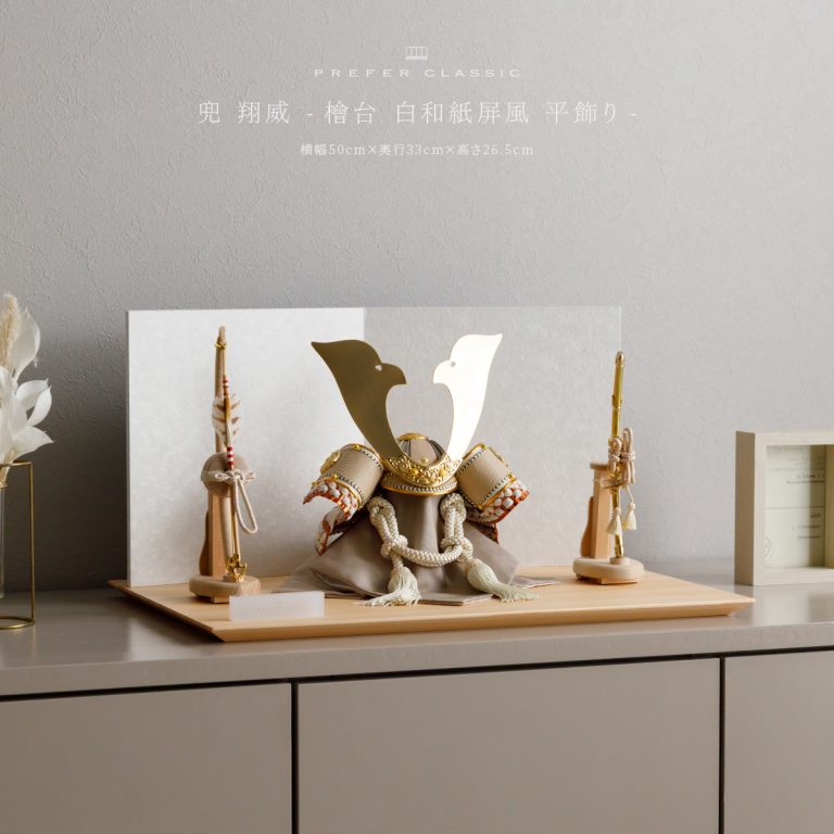 PREFER CLASSIC 五月人形[檜台 白和紙屏風 平飾り 弓太刀 白珠8号 翔威]