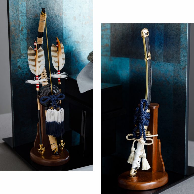 TOP > 五月人形 > ブランド > PREFER CLASSIC > PREFER CLASSIC 五月人形[黒塗台 緑玉屏風 櫃付 平飾り弓太刀 保津10号 プラチナ箔押 竹雀之兜]