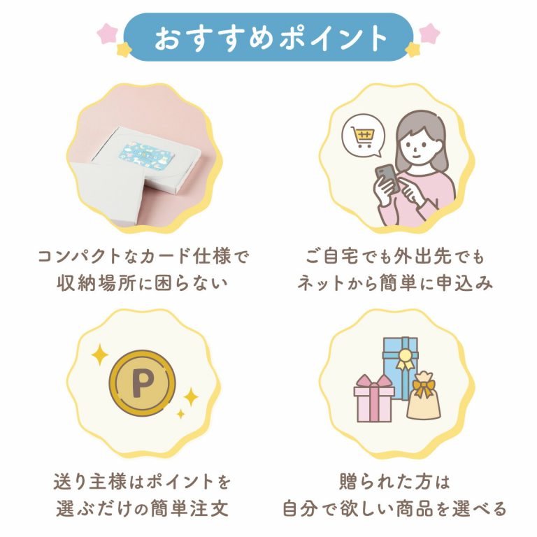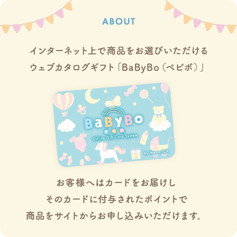 「BaByBo(ベビボ)お祝い用」は、インターネットで商品を選べるウェブカタログギフトです。お客様にはポイント付きのカードをお届けし、専用サイトからお好きな商品をご注文いただけます。カードタイプなのでかさばらず、収納もスマート。いつでもどこでもお申し込みでき、約400点の中から自由に商品をお選びいただけます。、大切なお祝いの贈り物にぜひご利用ください。