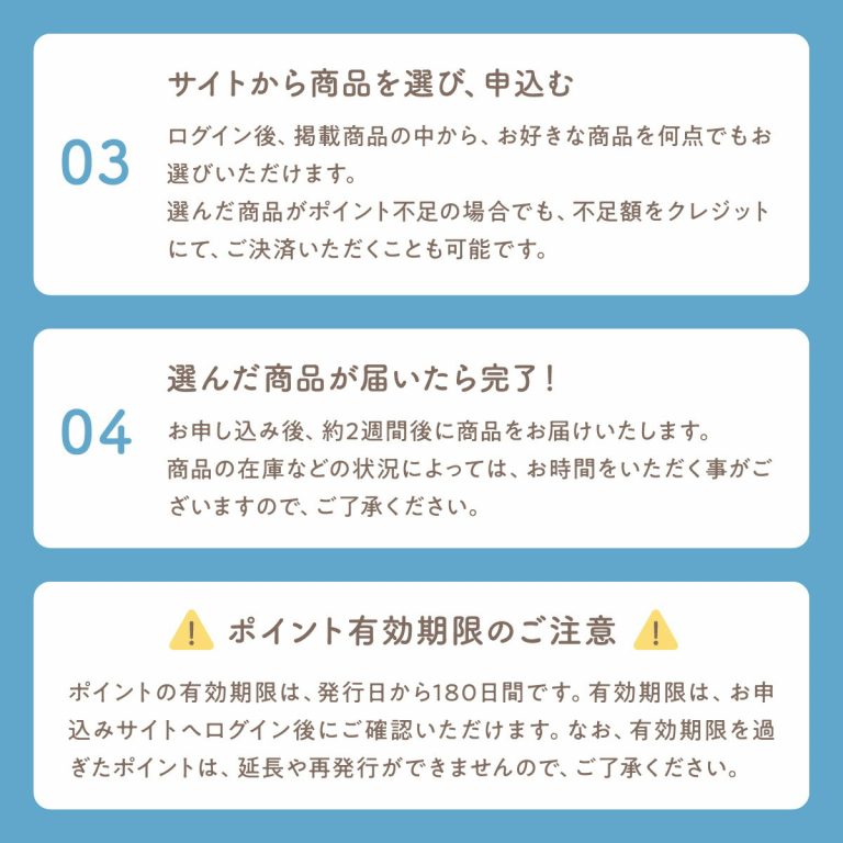 ※カードのポイントには有効期限がございます。ポイントの有効期限は、発行日から180日間です。有効期限は、お申込みサイトへログイン後にご確認いただけます。なお、有効期限を過ぎたポイントは、延長や再発行ができませんので、ご了承ください。