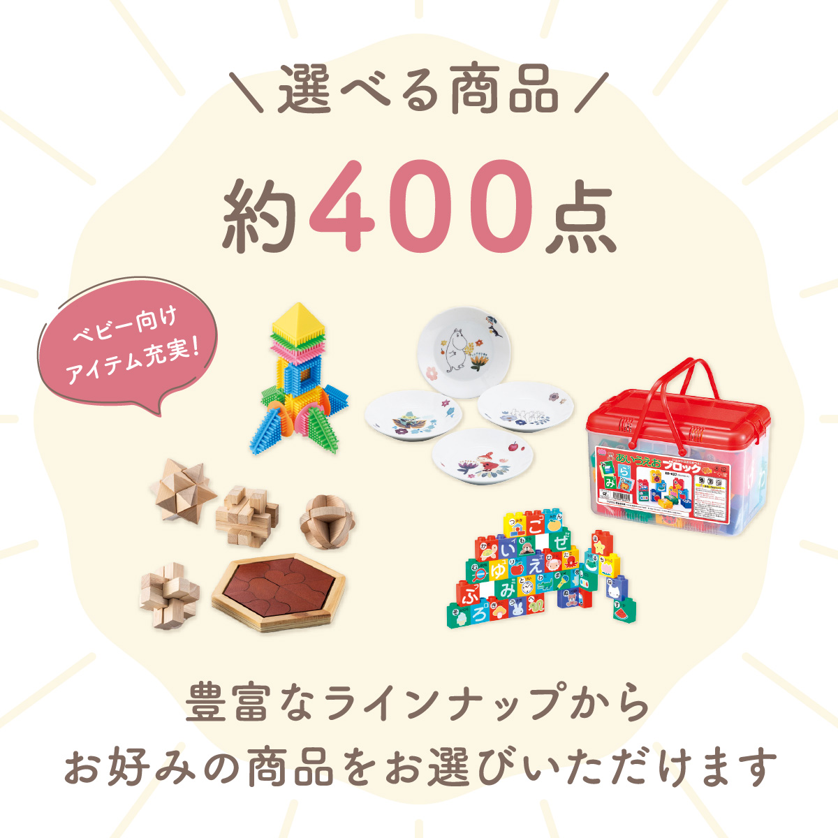 「BaByBo(ベビボ)お祝い用」は、インターネットで商品を選べるウェブカタログギフトです。お客様にはポイント付きのカードをお届けし、専用サイトからお好きな商品をご注文いただけます。カードタイプなのでかさばらず、収納もスマート。いつでもどこでもお申し込みでき、約400点の中から自由に商品をお選びいただけます。、大切なお祝いの贈り物にぜひご利用ください。