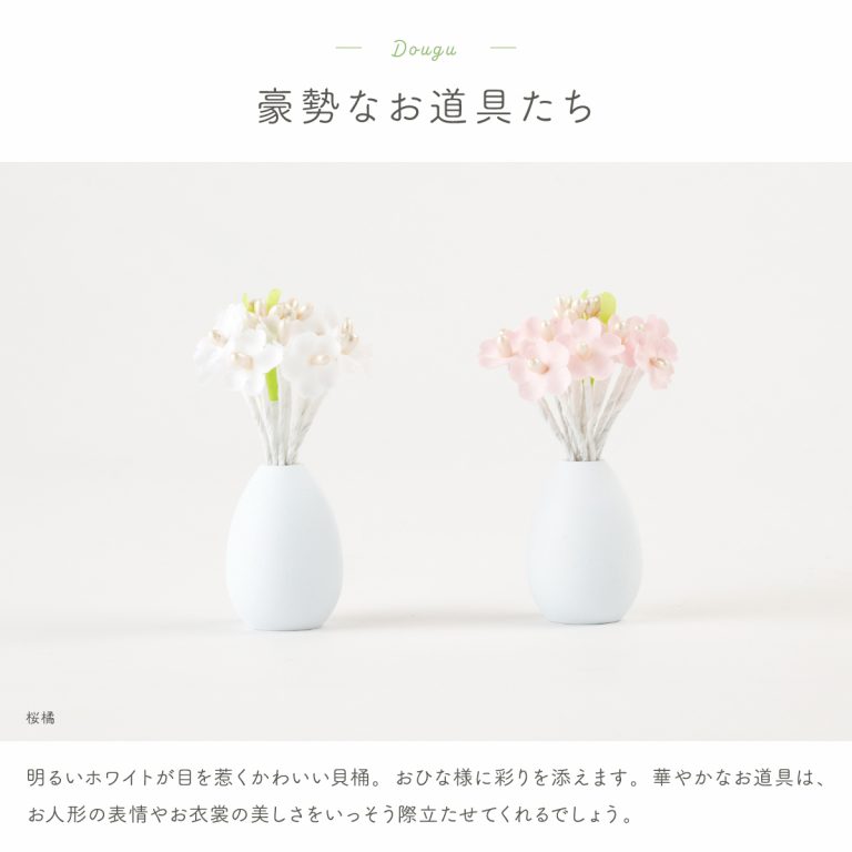 例)色ムラ・細かい生地のほつれ・お道具のお花の黒い点、細かな穴・パーツの接着部分の糊のはみ出し・三方の花瓶口の縁部分の塗装・桜橘の木部の微細な欠けやささくれ