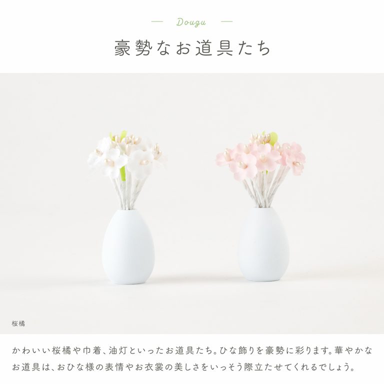 ※お道具のお花に黒い点や穴、パーツの接着部分に糊のはみ出しが見受けられる場合がございますが、生産工程上、避けられない仕様となります。