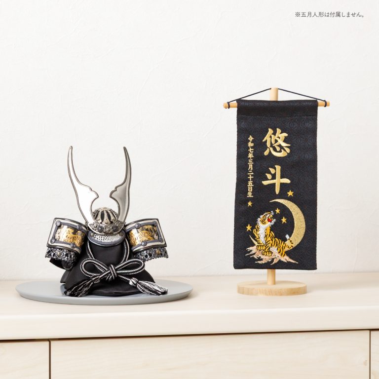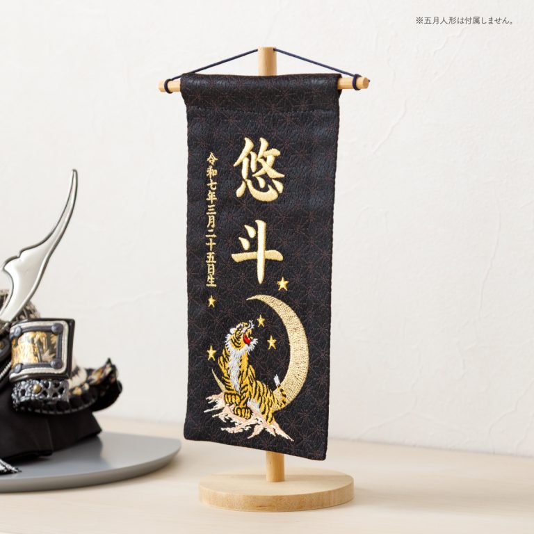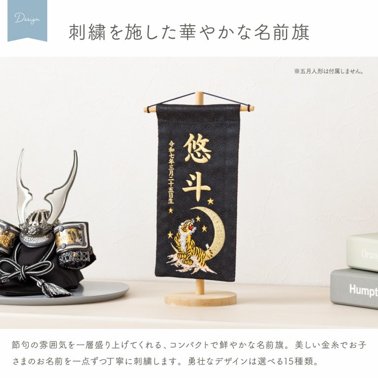 男の子向けの小サイズ名前旗。『ぷりふあ五月人形』との相性も抜群の、コンパクトなサイズ感です。場所を選ばずインテリア小物のようにおしゃれに飾っていただけます。兜飾りや鎧飾り、室内鯉のぼりと一緒に飾れば、端午の節句を華やかに彩ってくれるでしょう。こどもの日や初節句のギフトにもぴったりです。