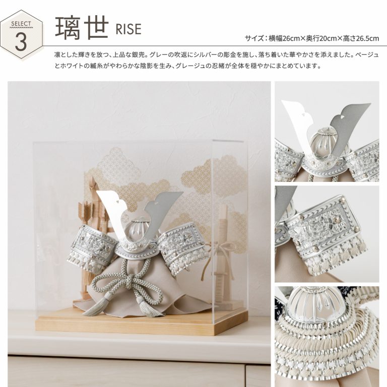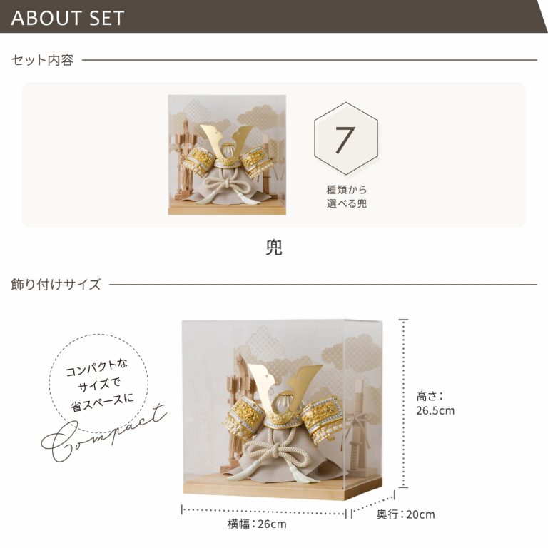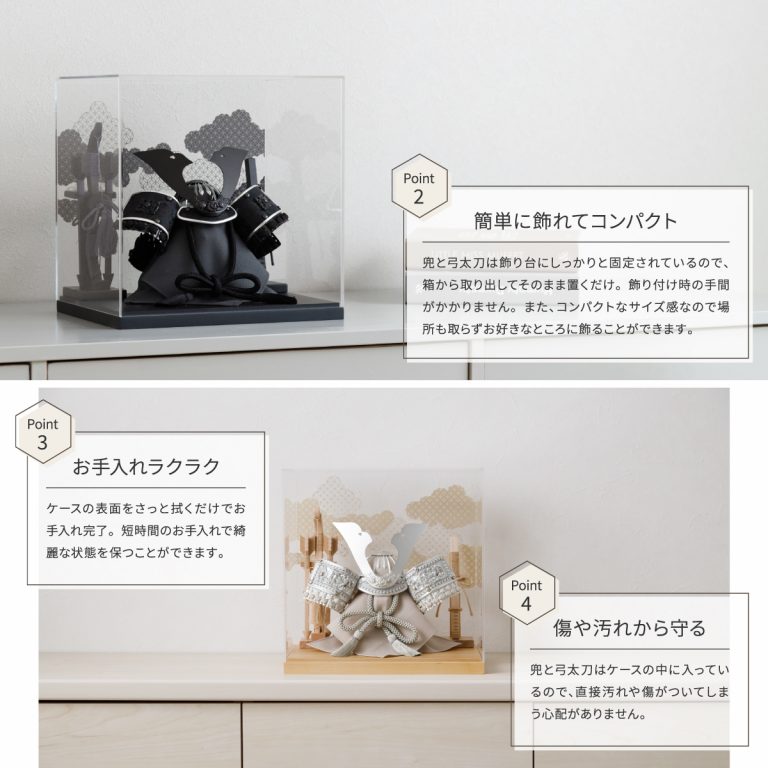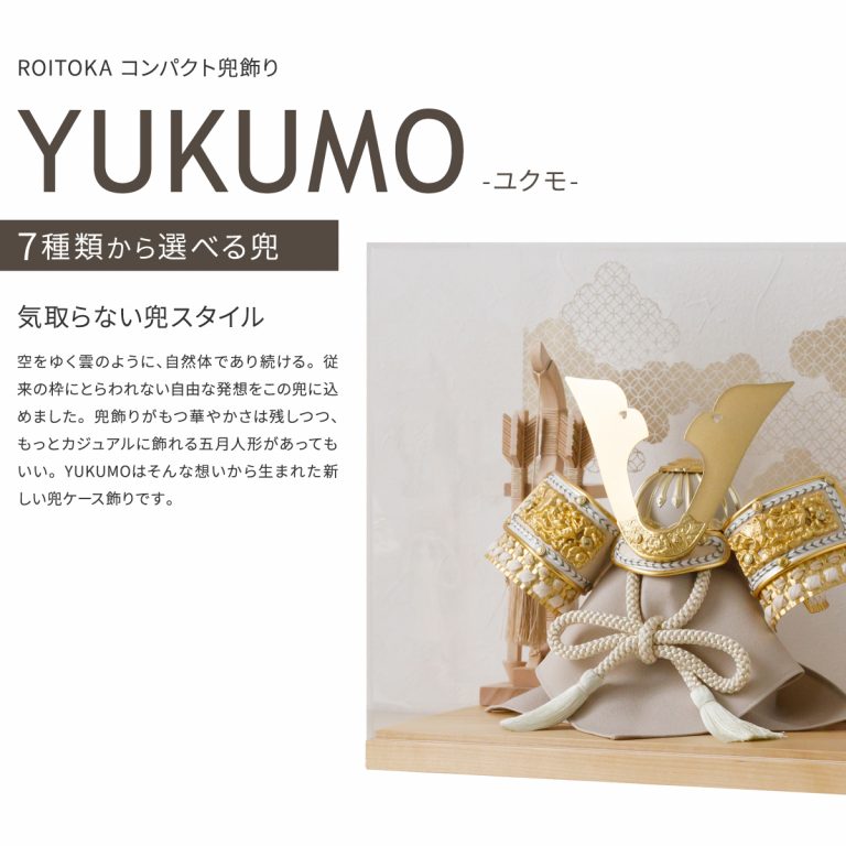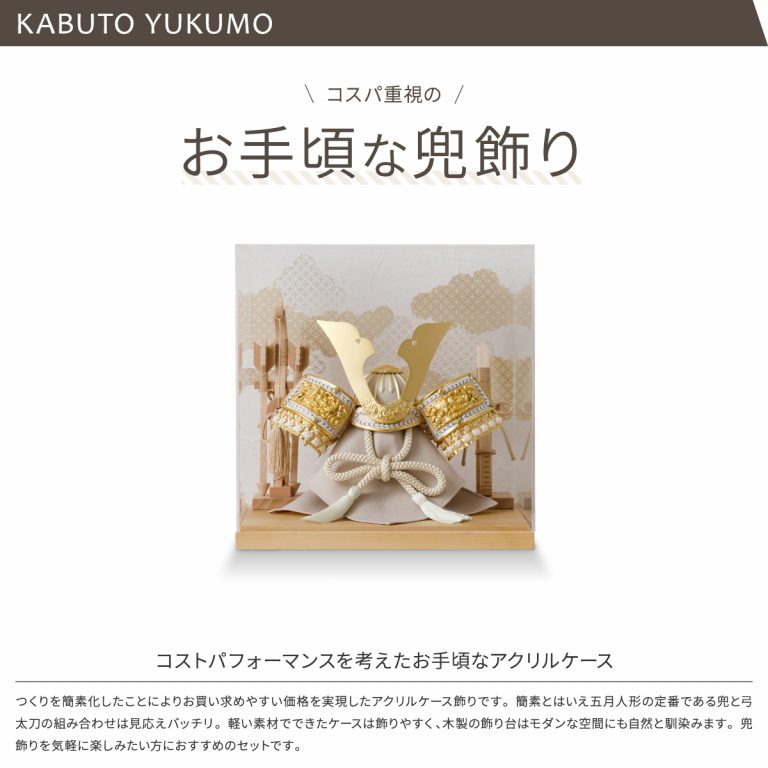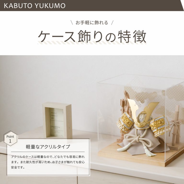 ケースタイプで人気の五月人形「YUKUMO」。アクリルケースの中に、勇ましい兜が輝くモダンな節句飾りです。限られたスペースにも飾れるコンパクトさも魅力のひとつです。周囲のインテリアに合うおしゃれな5月人形。端午の節句やこどもの日、初節句のお祝いギフトにもおすすめです。