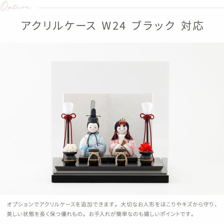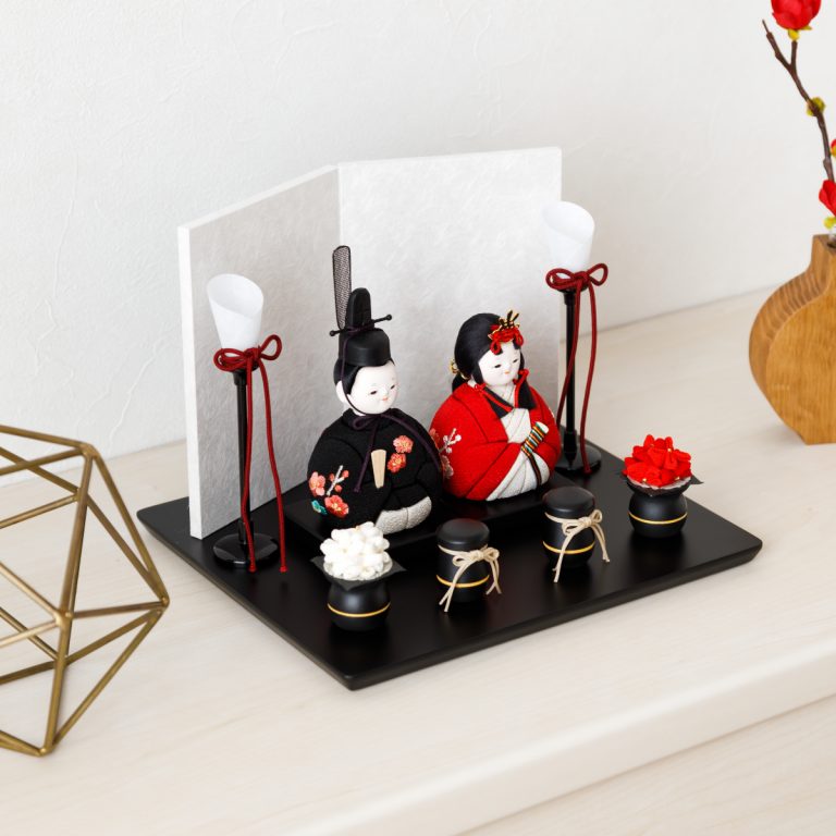 シンプルかつ飽きのこない美しさを追求した、コンパクトな雛人形。クラシカルながらどこかモダンな印象のデザインで、周囲のインテリアにもすっきりと馴染みます。黒色で統一した飾り台には美しい二曲屏風を合わせ、かわいいお雛様を華やかに演出。小さいサイズながら、ひな祭りにふさわしい見栄えの良い親王飾りに仕上げました。平飾りタイプのおひな様なので、ちょっとしたスペースにもおしゃれに飾ることができます。初節句のお祝いにもおすすめです。