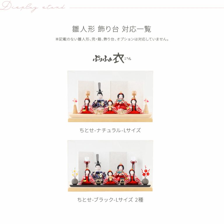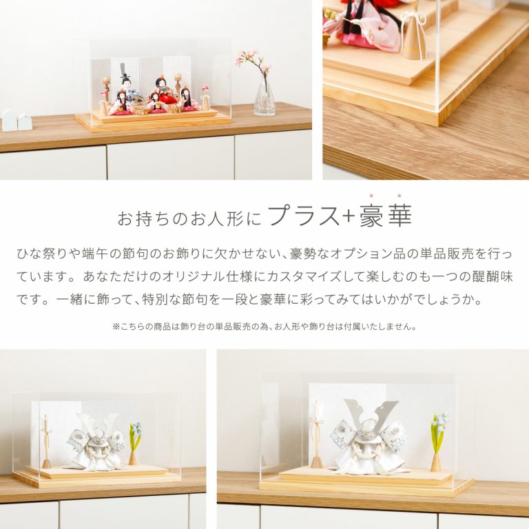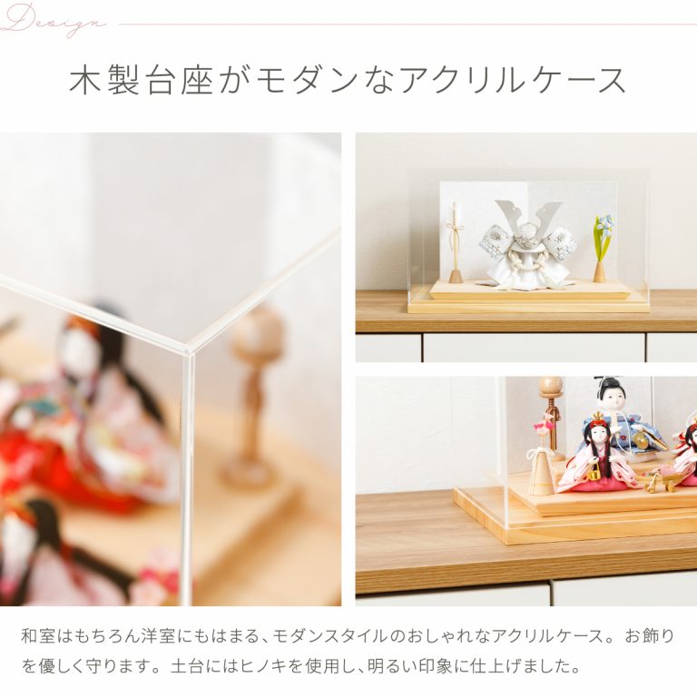 対応のぷりふあのおひな様と飾り台が収まるW43のアクリルケース。土台部分にはバーチ材を使用し、明るくすっきりとした印象に。どのデザインにも馴染んで、かわいい雛人形を優しく包み込んでくれます。ケース飾りはホコリや傷からひな人形やお道具を守ってくれるのでお手入れが簡単。大切なおひなさまを綺麗な状態で保てます。またコンパクトかつ透明なケースなので、お部屋の雰囲気を壊さず飾れてインテリアとしてもぴったりです。