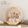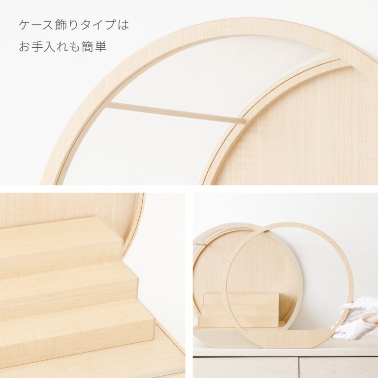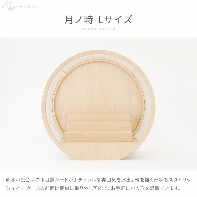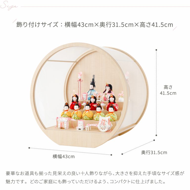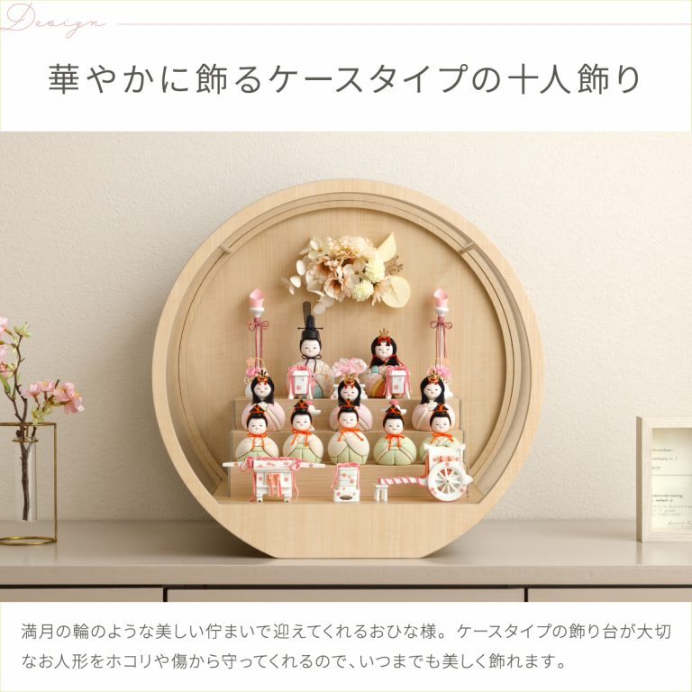 ナチュラルな色合いの木目調シートがインテリアに溶け込む、モダンスタイルの十人飾り。五人囃子に三人官女、豪華なお道具が揃った見栄えの良いおひな様です。満月のような形状のおしゃれな飾り台はケースタイプ。ほこりや傷からかわいい雛人形をしっかり守ります。マンションやアパートなどの現代の住宅事情に合わせ、大きさを抑えたコンパクトなひな飾りに仕上げました。女の子の成長をそっと見守る特別なお雛様。お部屋に華を添え、ひな祭りの雰囲気を一層盛り上げてくれるでしょう。お手入れ簡単なケース飾りは初節句やギフトにもぴったりです。