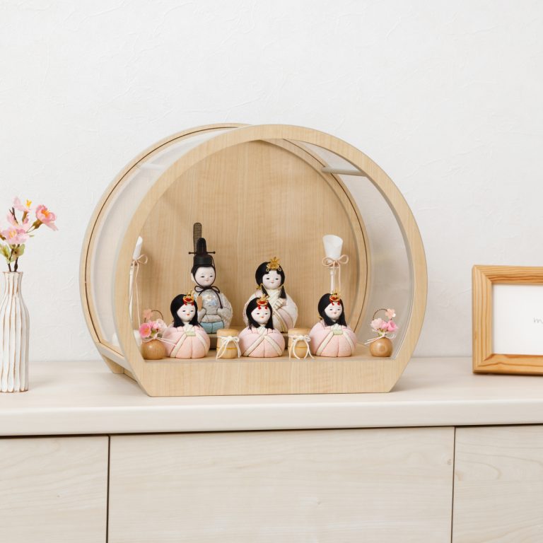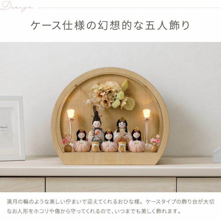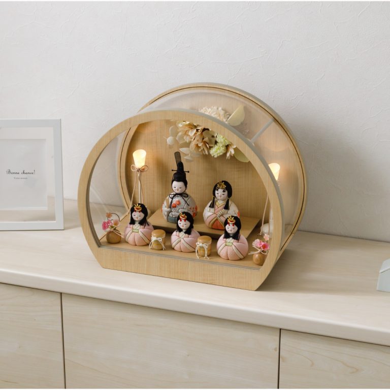 美しい木目調がモダンな雰囲気を漂わせるひな飾り。かわいいおひな様と三人官女がセットになった五人飾りは、初節句のお祝いや贈り物にも最適な雛人形です。ケース飾りのひな人形は、お手入れもらくらく。クリアケースがひな人形にほこりや傷が付くのを防いでくれます。満月のような綺麗な輪を描く飾り台はスタイリッシュでおしゃれなインテリアにもぴったり。洋風なお部屋でも和風なお部屋でも、スマートかつコンパクトにお雛様をお楽しみいただけます。