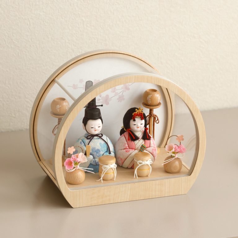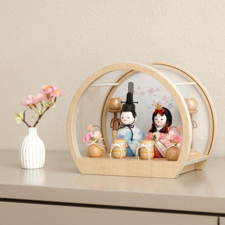 優しい曲線を描く飾り台がインテリアに調和する、コンパクトな親王飾りのおひな様。ころんとかわいい雛人形が、クリアケースの中で微笑みます。満月のようなおしゃれな形状の飾り台は、和室はもちろん、モダンな洋室にも調和してくれます。小さいサイズのひな飾りなので、お好みの場所でお楽しみいただけます。ケース飾りはお手入れもお片付けもラクラクです。ひな祭りを彩る、女の子にとって特別なお雛様。可愛いお子さまの初節句のお祝いや、ギフトとしてもおすすめの逸品です。