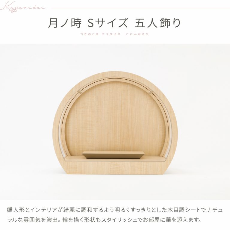 美しい木目調がモダンな雰囲気を漂わせるひな飾り。かわいいおひな様と三人官女がセットになった五人飾りの「月ノ時 小 ケース」は、初節句のお祝いや贈り物にも最適な雛人形のケース飾りタイプです。クリアケースで覆われているため、ひな人形にほこりや傷が付くのを防いでくれます。満月のような綺麗な輪を描く飾り台はスタイリッシュでおしゃれなインテリアにもぴったり。洋風なお部屋でも和風なお部屋でも、スマートかつコンパクトにお雛様をお楽しみいただけます。