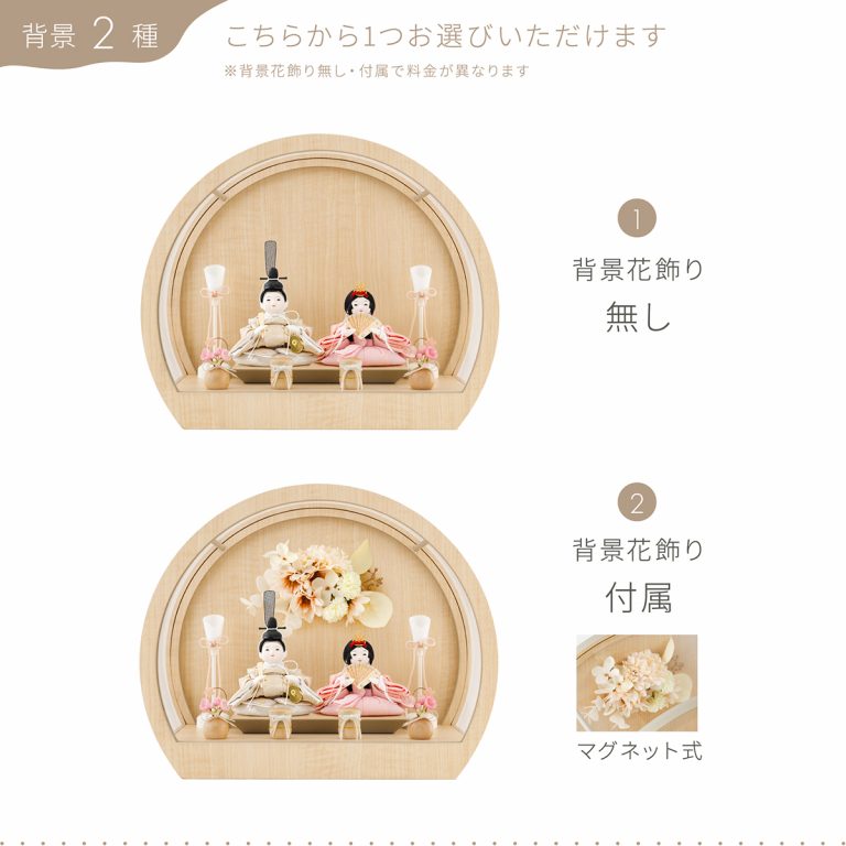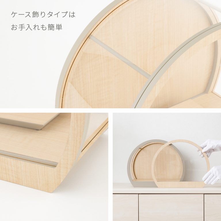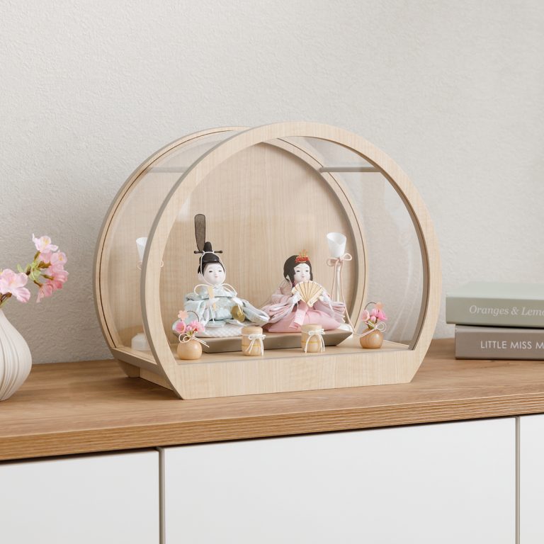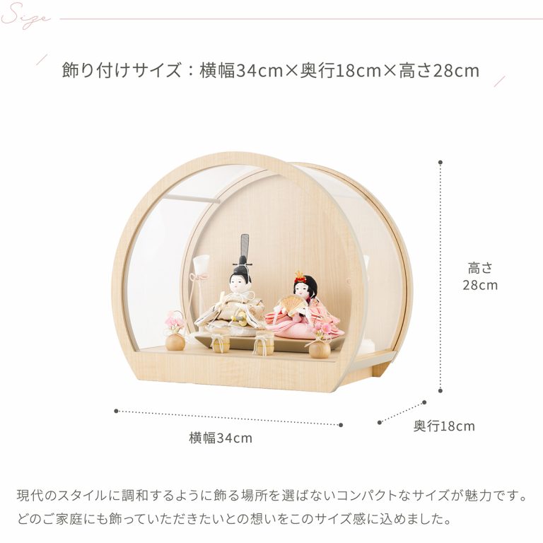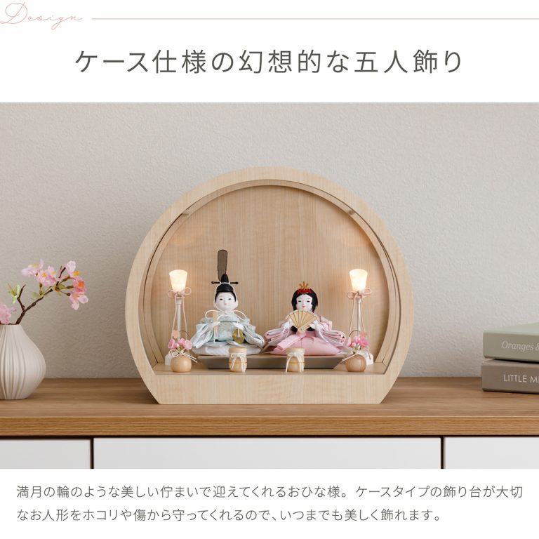 クリアケースに守られて微笑むかわいいおひな様。満月のような飾り台がおしゃれな雰囲気を演出する、コンパクトで飾りやすい親王飾りの雛人形です。お手入れ簡単で人気のケース飾りを、お好みの場所で楽しめる小さいサイズに仕上げました。ナチュラルな色味のひな飾りはどんなインテリアにも合わせやすく、和室はもちろんモダンな洋室にもはまります。ひな祭りに華を添えてくれる、特別なおひな様。可愛いお子さまの初節句のお祝いや、おめでたい日のギフトにもおすすめです。
