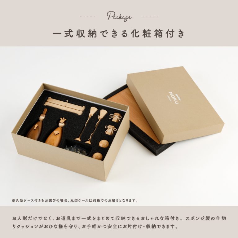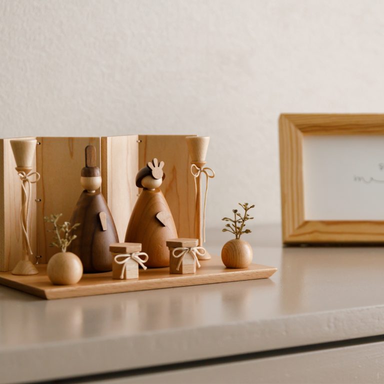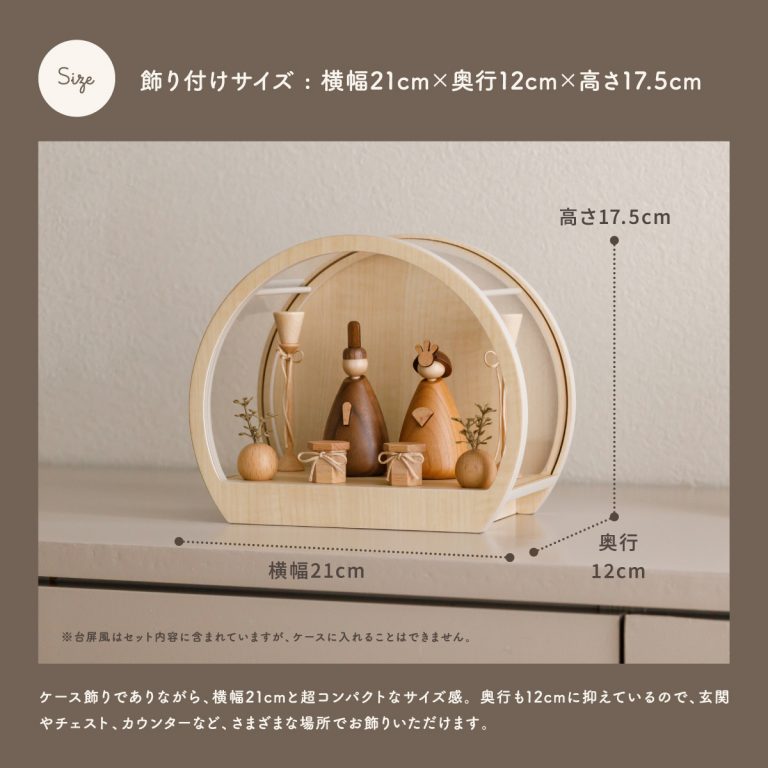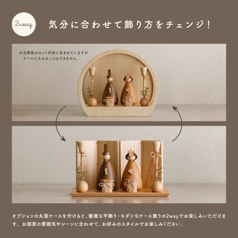 4種の天然木から生まれた、小さいサイズの木製雛人形。オプションのクリアケースをプラスして、平飾り・ケース飾り2種類のお雛様を楽しめます。ひな祭りはもちろん、インテリアのように通年で飾れるおしゃれでモダンなデザイン。お子さまの初節句やお祝いギフト、プレゼントにもおすすめの逸品です。
