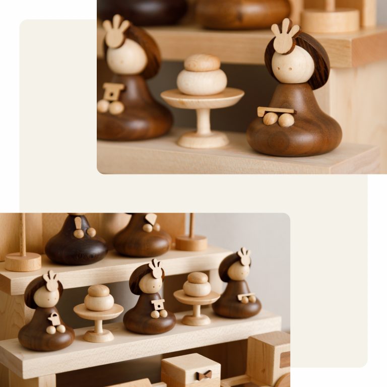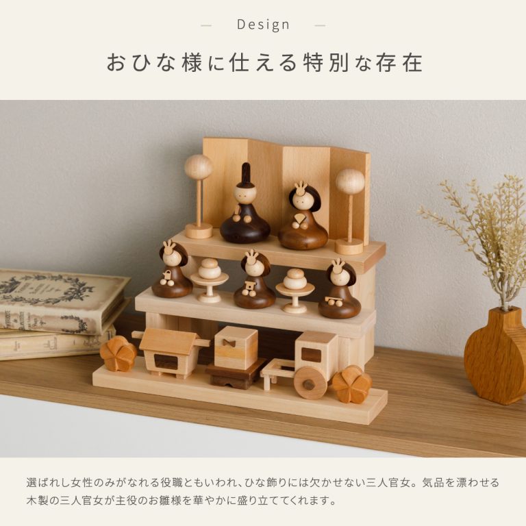 天然木から生まれた、ころんと小さいサイズの三人官女。木ならではのぬくもりがおしゃれな、インテリアのように楽しめるナチュラルモダンなおひな様です。木製雛人形sarisaの親王飾りと合わせれば、かわいい五人飾りが完成します。