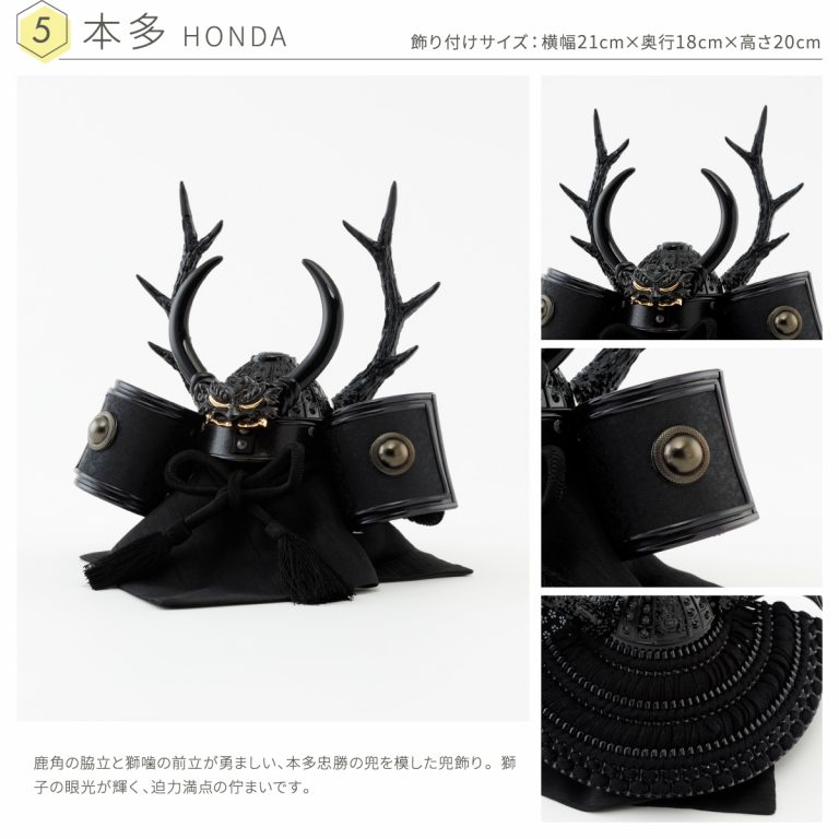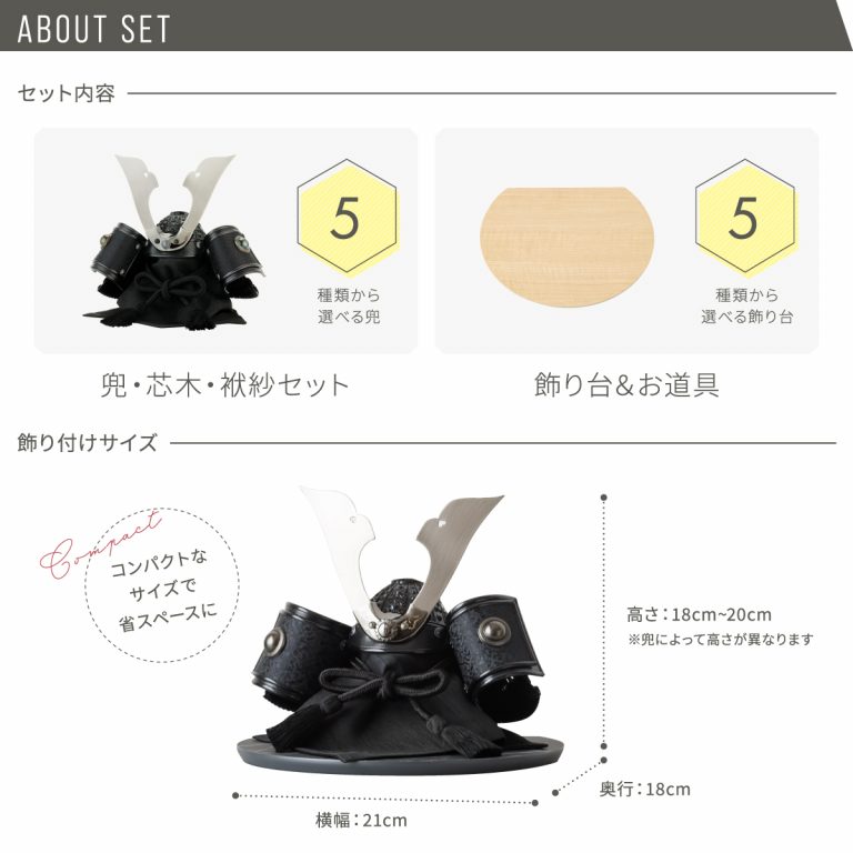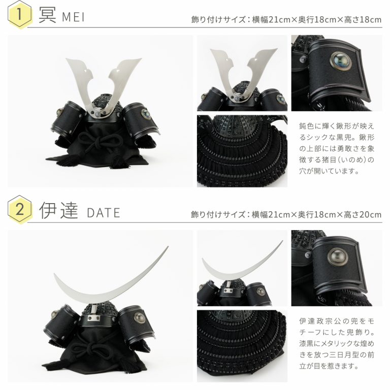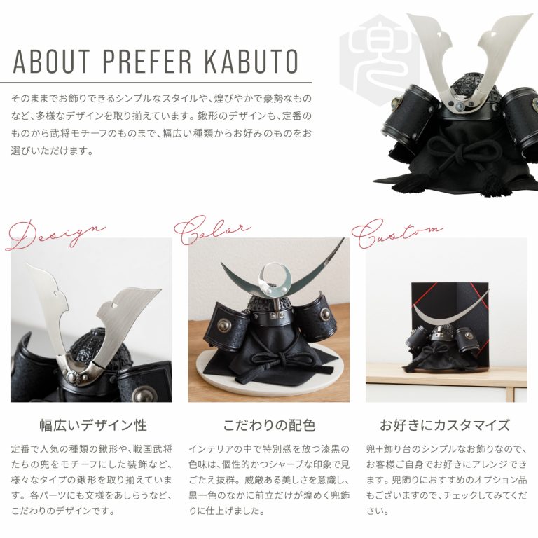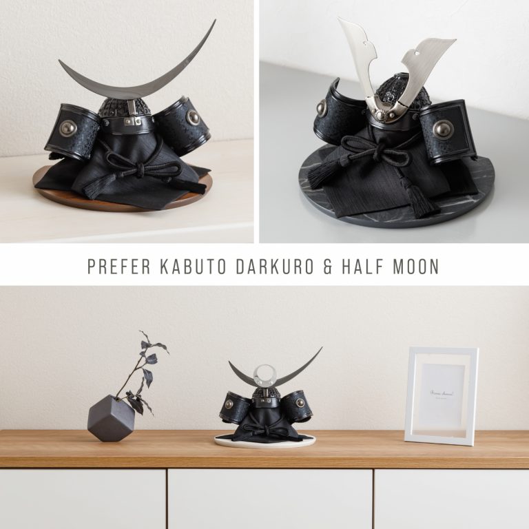 勇ましい風合いを醸し出す漆黒の兜飾りを人気のコンパクトサイズに仕上げました。匠の技で研ぎ澄まされた端正な出立ちは、おめでたい節句飾りにも、インテリアにもおすすめです。半月を連想させるようなロマンチックな飾り台は、お部屋や兜飾りに合わせて5種類から選べます。兜の色味や装飾を引き立てるシンプルモダンかつおっしゃれなフォルムで、五月人形そのものの美しさを存分に楽しむことができます。