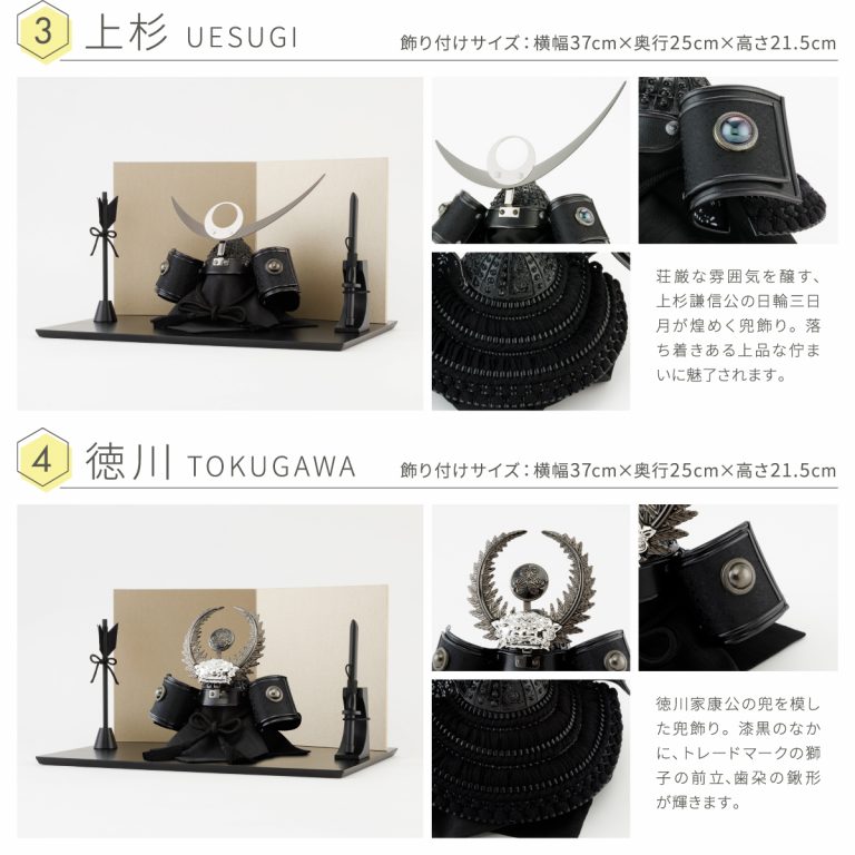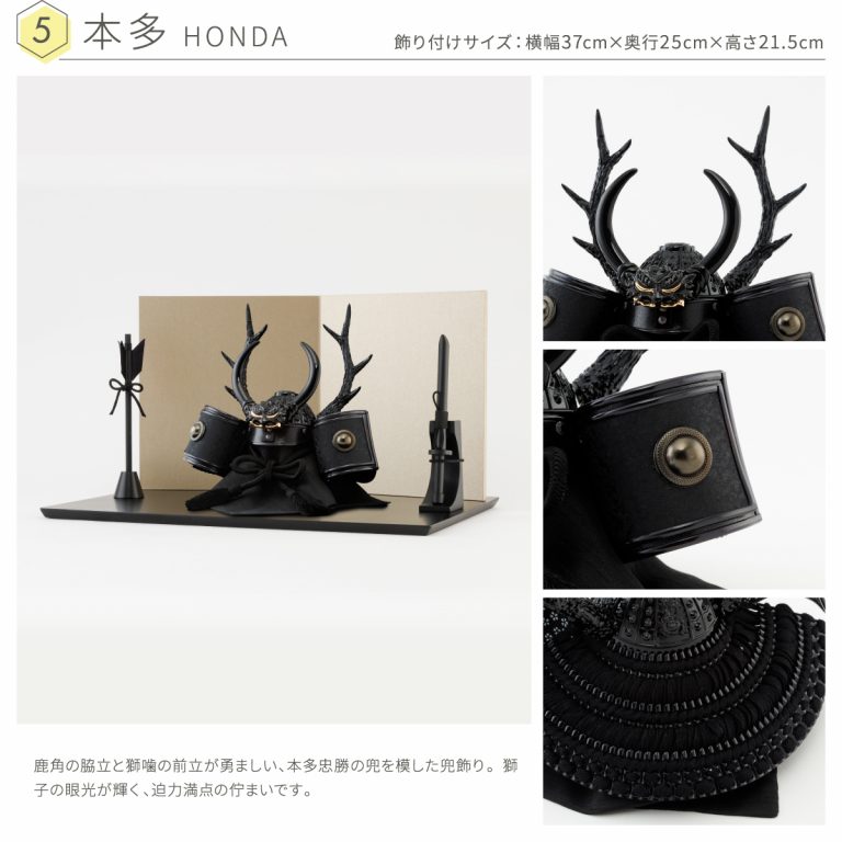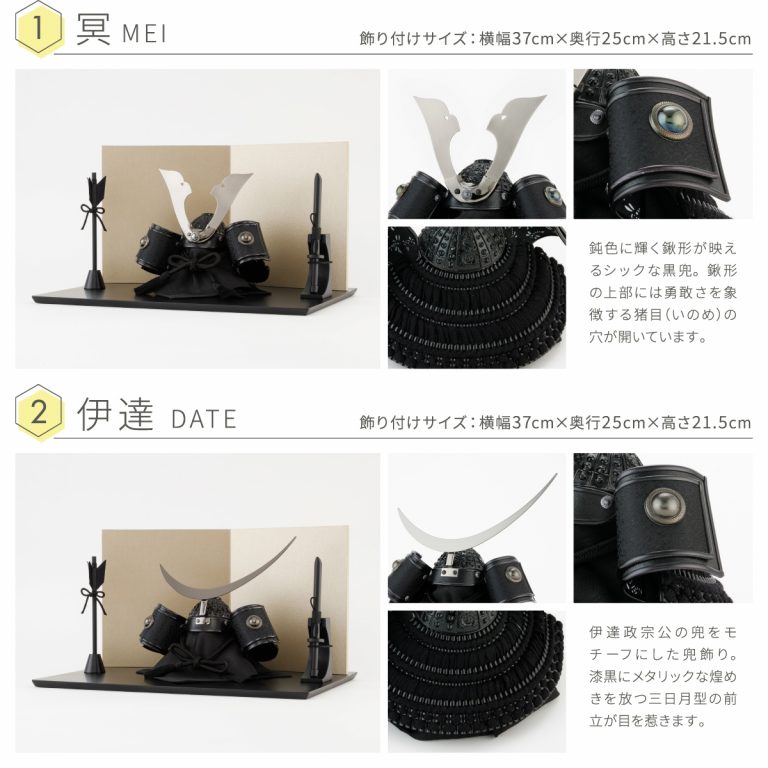 勇ましい風合いを醸し出す漆黒の兜飾りを人気のコンパクトサイズに仕上げました。匠の技で研ぎ澄まされた端正な出立ちは、おめでたい節句飾りにも、おしゃれなインテリアにもおすすめです。兜を引き立てるモダンな佇まいの飾り台は、カラーをあえて黒に統一。兜の煌めきや細工の美しさがより際立つクールなデザインです。シンプルながら上品な風合いで、特別な日に華を添えてくれるでしょう。脇飾りはお好みのものをお選びください。平飾りタイプなので組み立ても不要。かっこいい5月人形は、こどもの日や初節句のお祝いにもぴったりです。