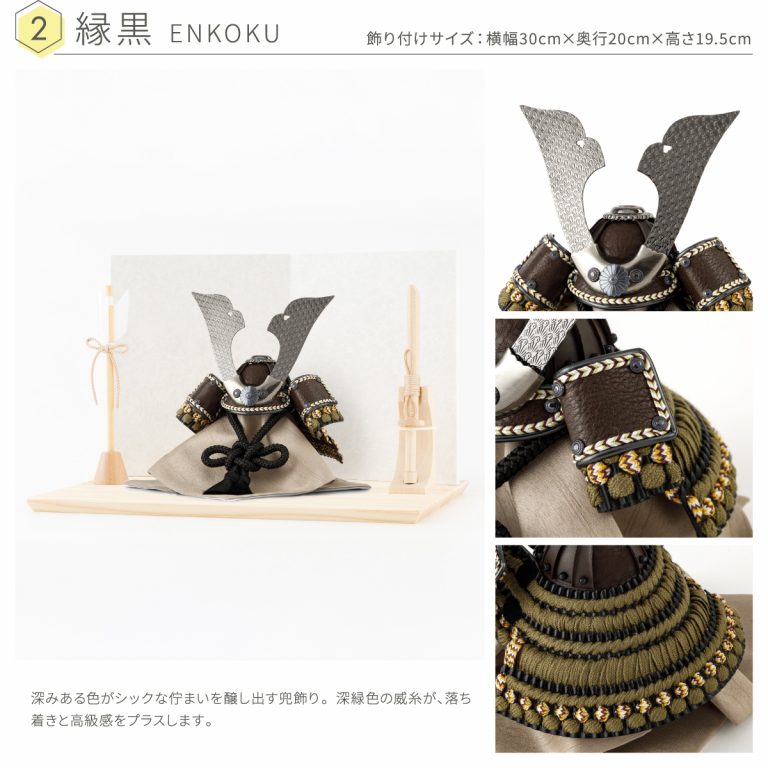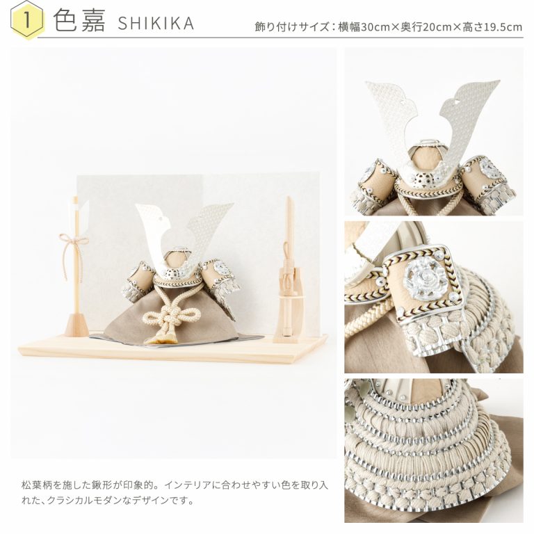 ベージュやブラウンといった、お部屋に溶け込む色合いのコンパクトな兜飾り。モダンな空間にも合うおしゃれなデザインと、勇ましさの両立を追求した五月人形です。きめ細かい木目が印象的な国産檜(ひのき)を使用した飾り台は、シンプルながら温かみを感じられる仕上がり。組み立て不要な小さいサイズの平飾りなので、お好みのスペースでインテリアのように楽しむことができます。脇飾りはお好みのものをお選びください。こどもの日や端午の節句に華を添える、ぷりふあのかっこいい5月人形。初節句のお祝いギフトにもおすすめです。