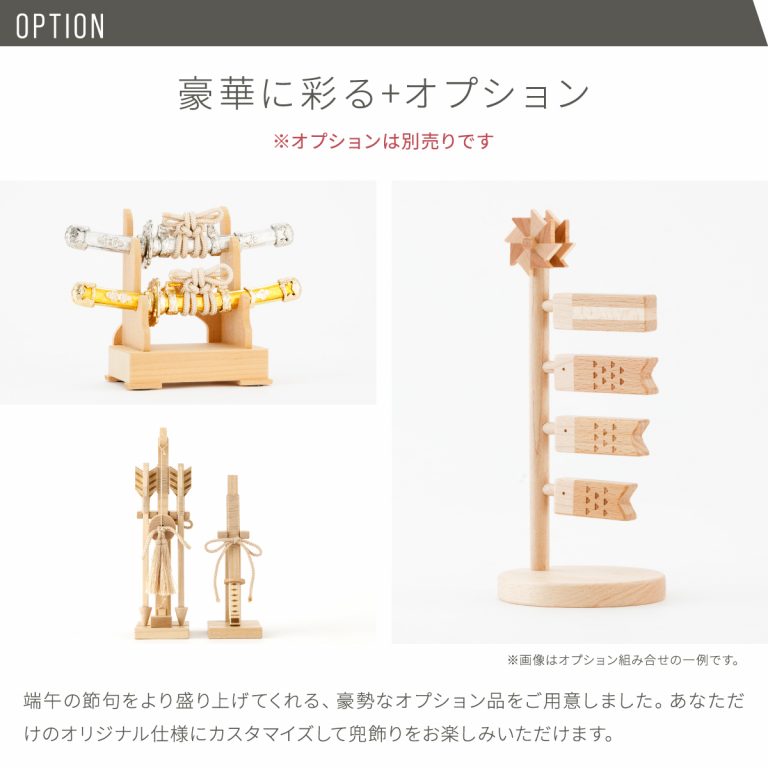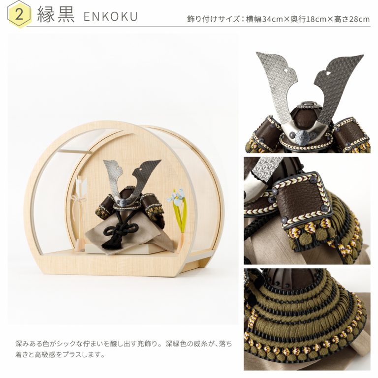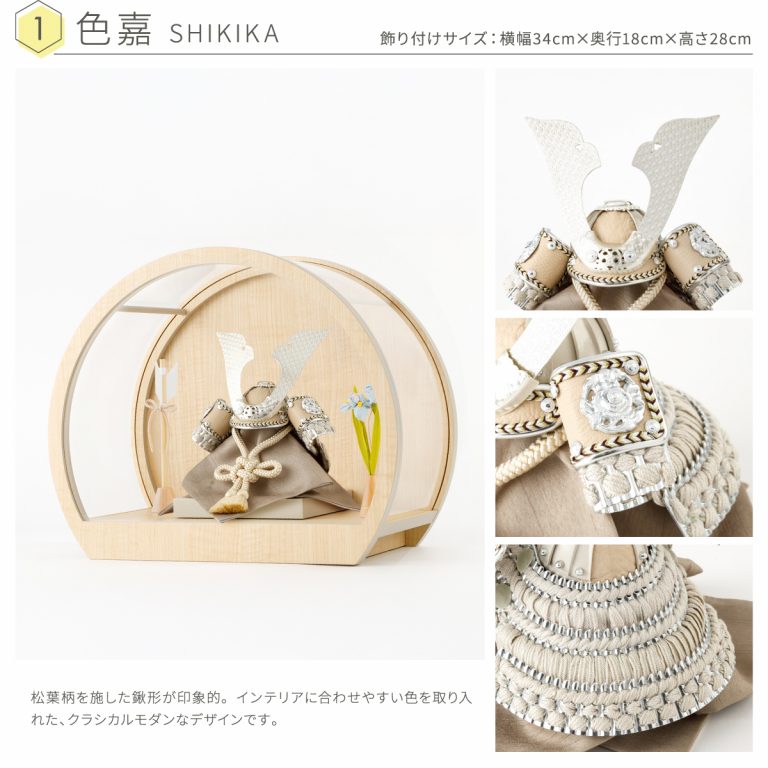 ベージュやブラウンといった、お部屋に溶け込む色合いのコンパクトな兜飾り。モダンな空間にも合うデザインと、勇ましい佇まいの両立を追求した五月人形です。雅な半月のような飾り台は、伝統的な兜飾りと現代のインテリアが調和するよう、明るめの木目調シートでナチュラルな雰囲気を演出。輪を描く丸型もスタイリッシュです。五月人形を引き立てる脇飾りはお好みのものをお選びください。ケースタイプなのでお手入れも簡単。毎年のこどもの日や端午の節句はもちろん、初節句のお祝いギフトにもおすすめです。