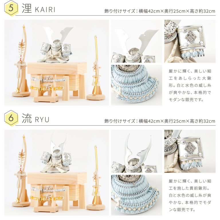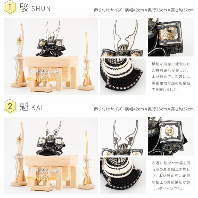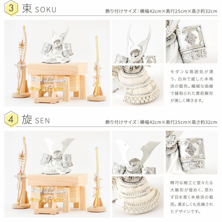 繊細な作りと華やかさを兼ね備えた重厚感のあるコンパクトな兜飾り。大切なお子様の健やかな成長を願う五月人形にぴったりの節句飾りです。端午の節句に欠かせない弓太刀・二段太刀が付属した飾り台セット。5月人形で飾る弓や太刀には魔除けの意味が込められており、初節句にもおすすめ。収納タイプの飾り台には白く美しい表情の檜(ひのき)を使用し、豪勢ながら素朴で奥ゆかしい仕上がりです。