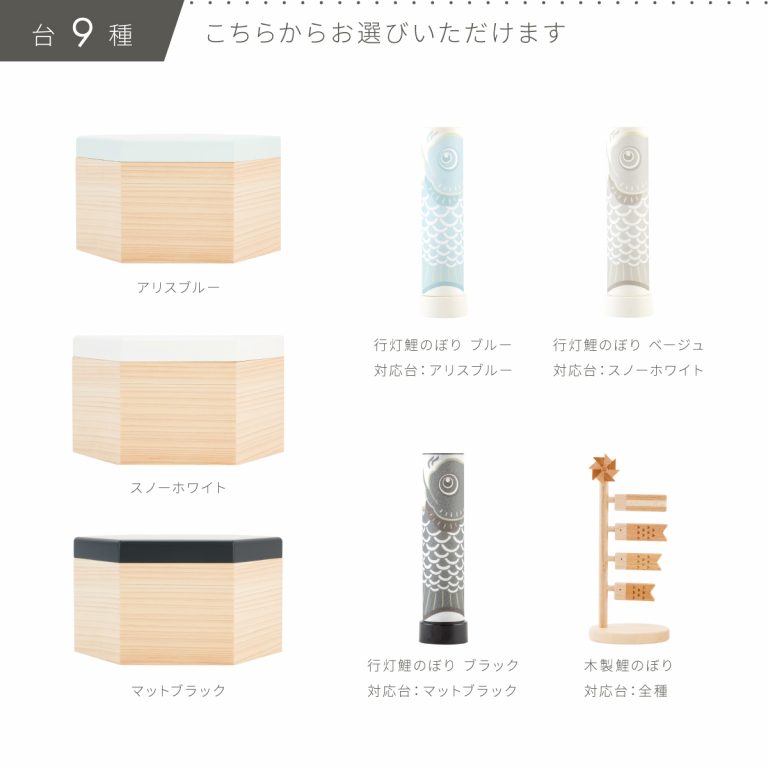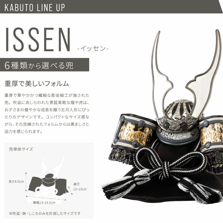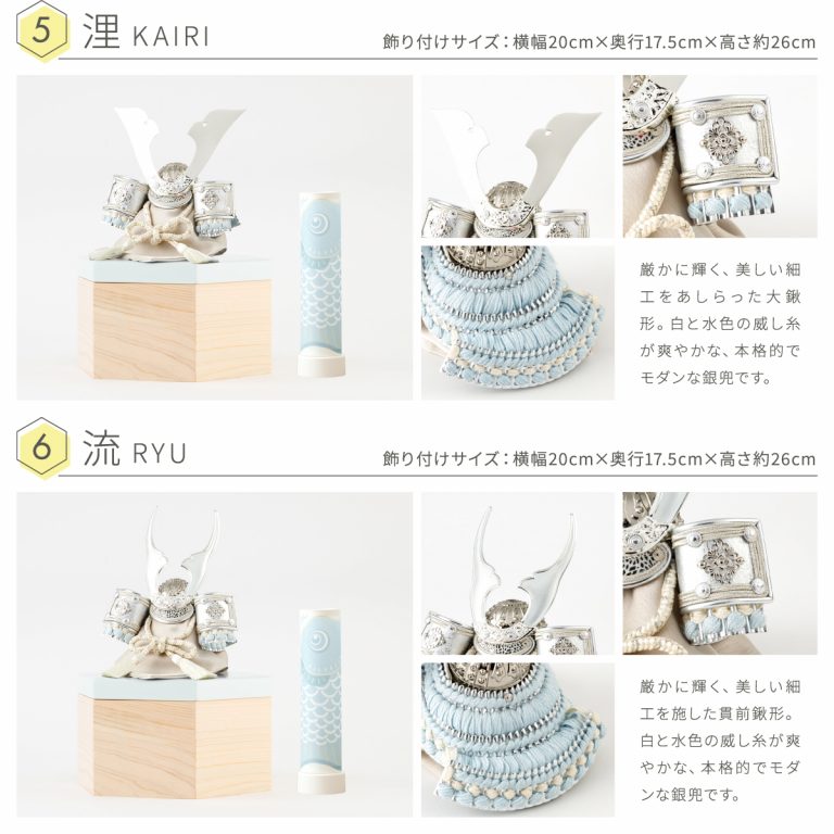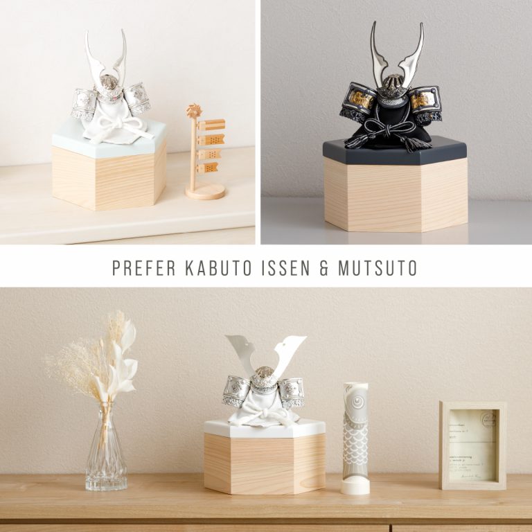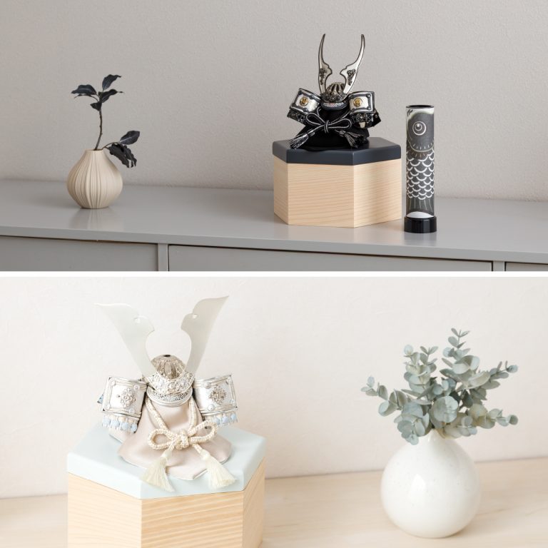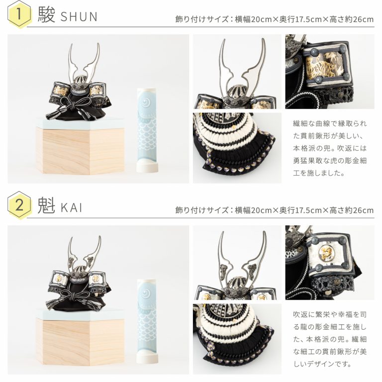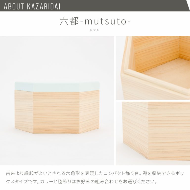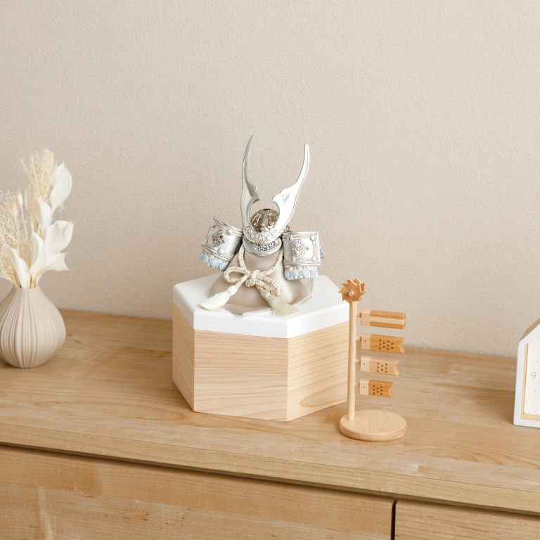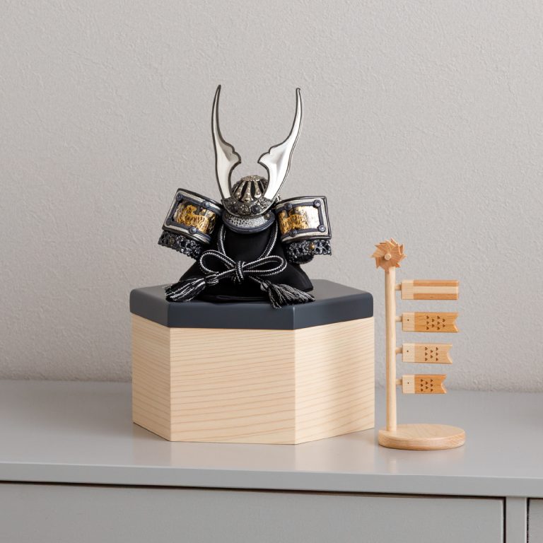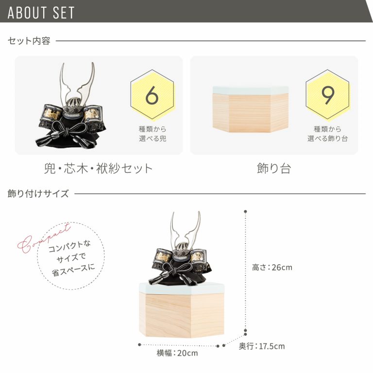 繊細な作りと華やかさを兼ね備えた重厚感のあるコンパクトな兜飾り。脇飾りはお部屋の雰囲気や兜に合わせてお選びください。古来より縁起がよいとされる六角形を表現したコンパクト飾り台は、兜を収納できるスペースが付いたボックスタイプ。カラーは、アリスブルー・スノーホワイト・マットブラックの3種類からお選びいただけます。