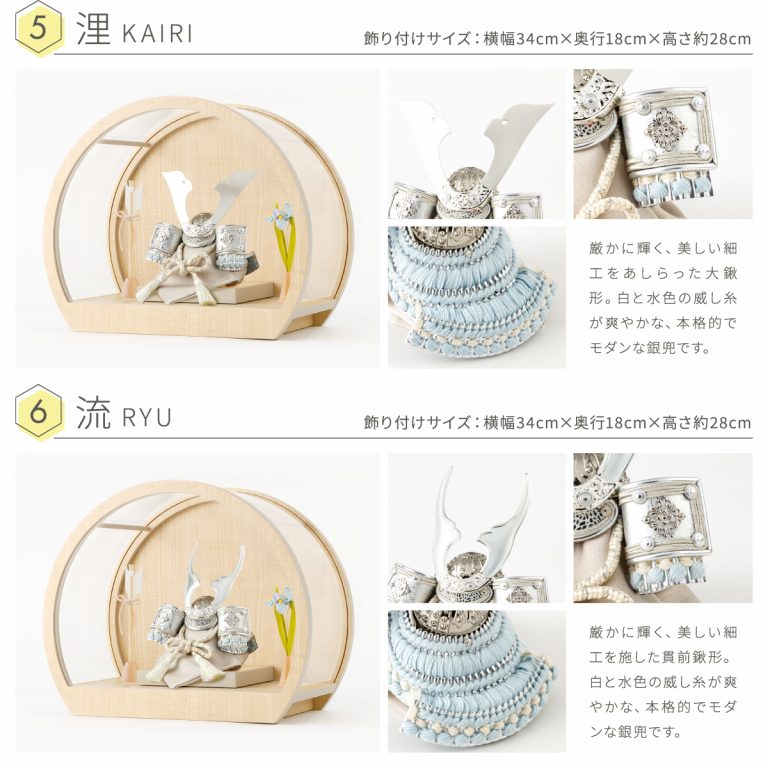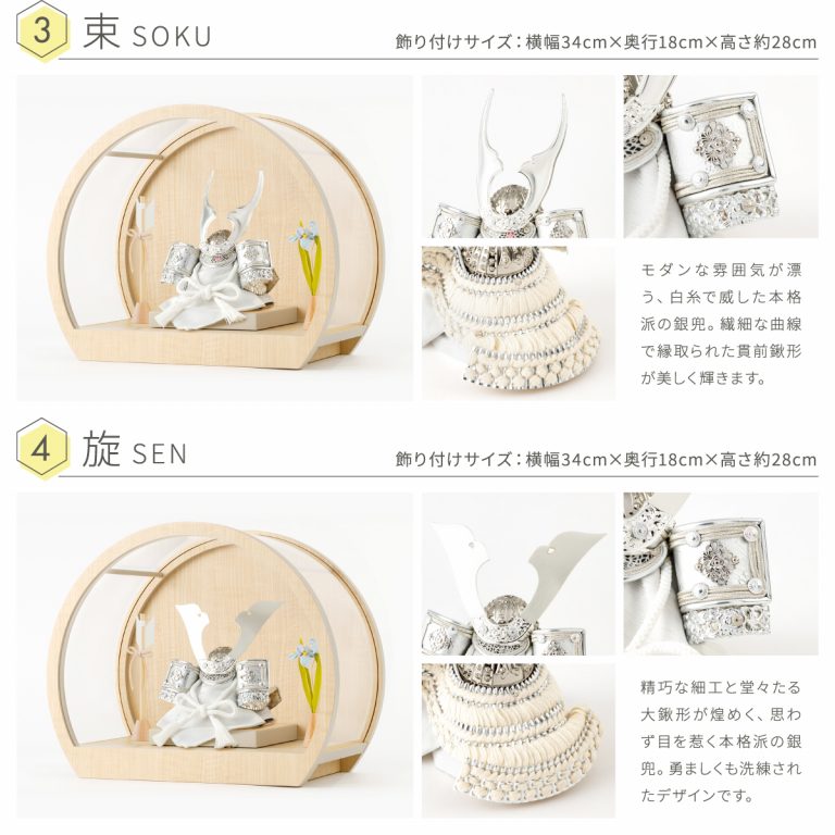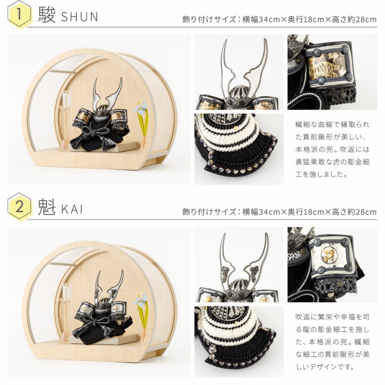 定番で人気の種類の鍬形を取り揃えています。各パーツにも文様をあしらうなど、こだわりのデザインです。伝統的な兜飾りと現代のインテリアが調和するように、明るめの木目調シートでナチュラルな雰囲気を演出する飾り台。勇ましい脇飾りと共に五月人形を引き立ててくれます。輪を描く丸型もスタイリッシュでお部屋に華を添えます。ケースタイプなのでお手入れも簡単です。