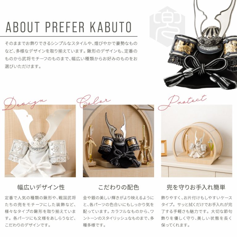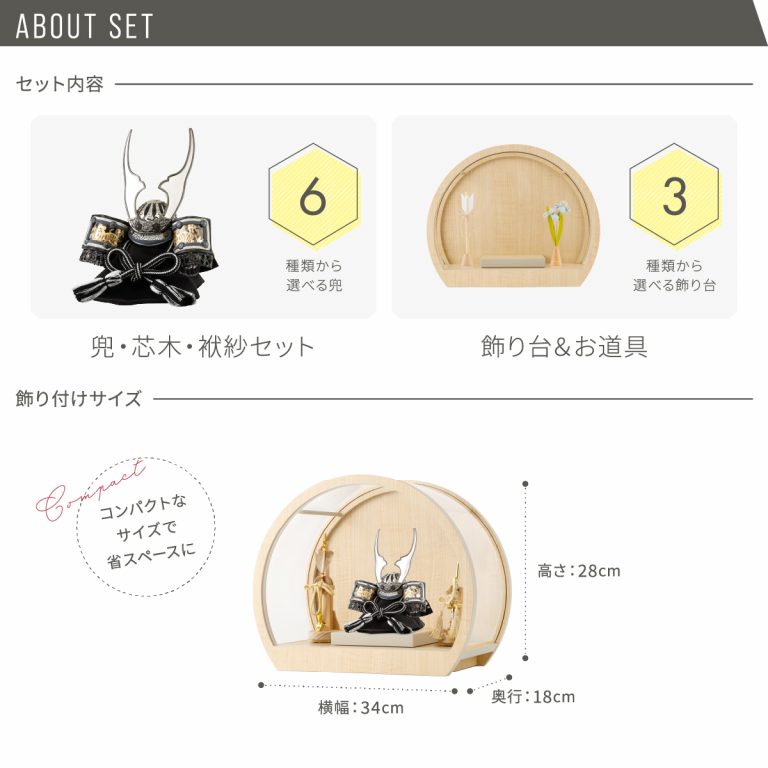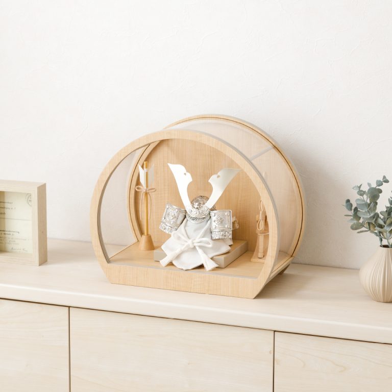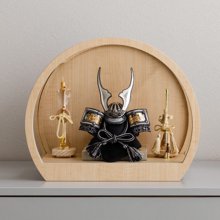 定番で人気の種類の鍬形や、戦国武将たちの兜をモチーフにした装飾など、様々なタイプの鍬形を取り揃えています。各パーツにも文様をあしらうなど、こだわりのデザインです。伝統的な兜飾りと現代のインテリアが調和するように、明るめの木目調シートでナチュラルな雰囲気を演出する飾り台。勇ましい脇飾りと共に五月人形を引き立ててくれます。輪を描く丸型もスタイリッシュでお部屋に華を添えます。ケースタイプなのでお手入れも簡単です。