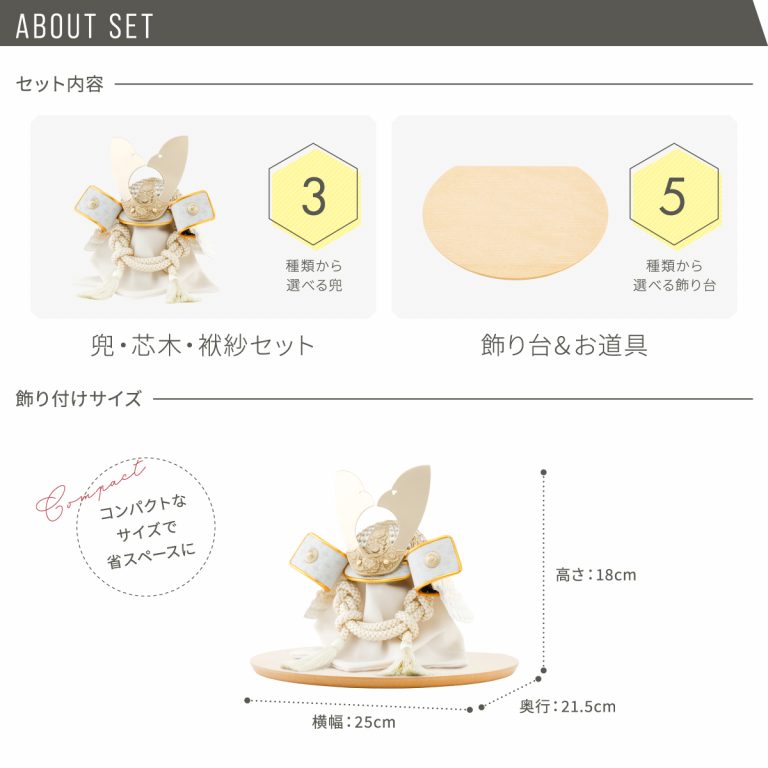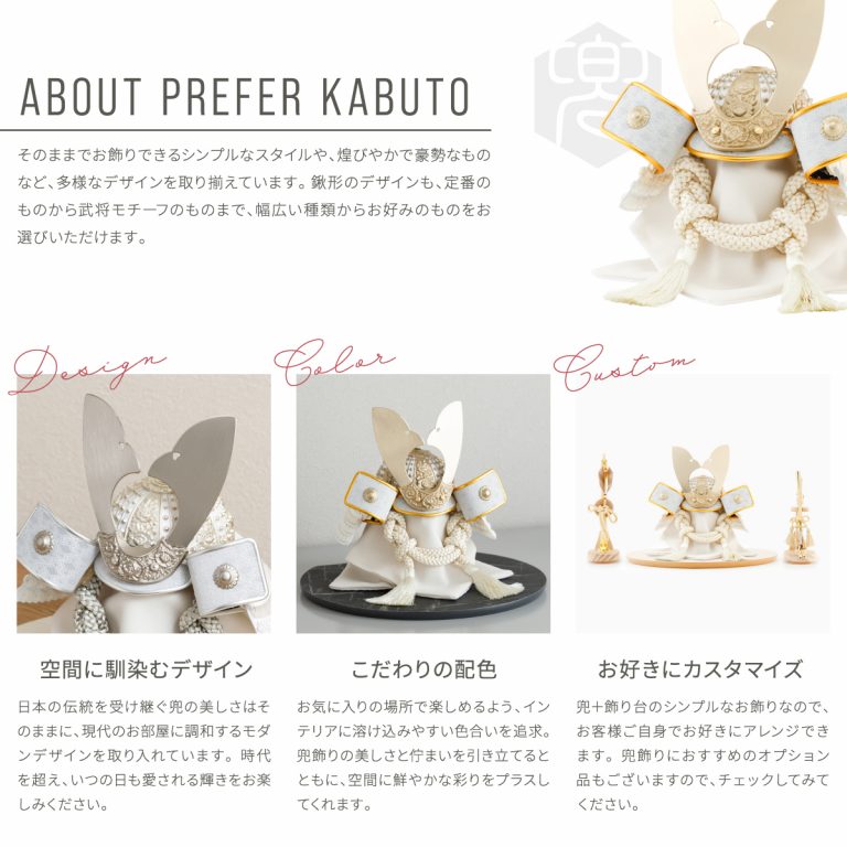 丸みを帯びた鉢と鍬形が、たくましさと優しさを感じさせるインテリア兜飾り。お部屋に馴染む上品かつおしゃれな色合いとコンパクトなサイズ感にこだわりました。伝統とモダンが見事に融合した逸品です。半月を連想させるようなロマンチックな飾り台は、お部屋や兜飾りに合わせて5種類から選べます。なかでも木製のバーチ・ウォールナットは日本家具産業会認定の国産品。シンプルですっきりとしたフォルムなので5月人形を存分に楽しめます。小さいサイズの節句飾りなので、省スペースで飾れるのも魅力です。こどもの日や端午の節句に華を添える、ぷりふあのかっこいい五月人形。初節句のお祝いギフトにもおすすめです。