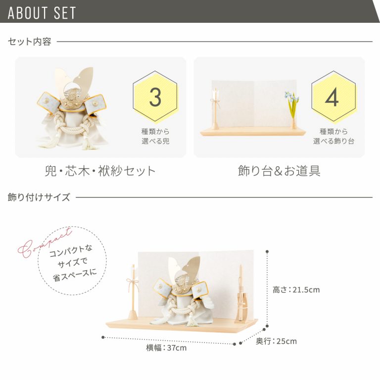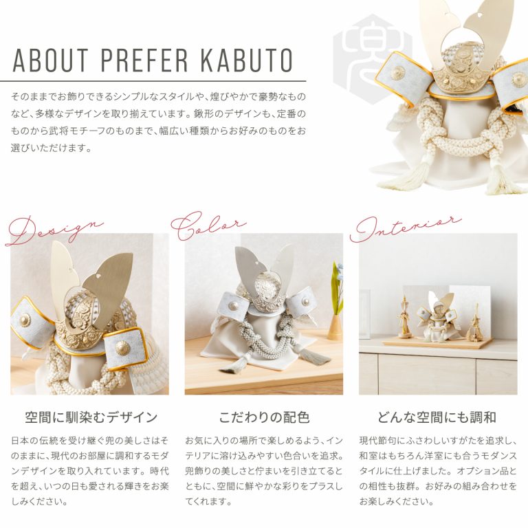 丸みを帯びた鉢と鍬形が、たくましさと優しさを感じさせるインテリア兜飾り。おしゃれかつ上品な色合いとコンパクトなサイズ感にこだわりました。伝統とモダンが融合した五月人形です。きめ細かい木目が印象的な国産檜(ひのき)を使用した飾り台は、シンプルながらどこかぬくもりを感じられる仕上がり。趣のある和紙屏風を合わせ、こどもの日や端午の節句を一層華やかに演出してくれます。脇飾りはお好みのものをお選びください。特別な日を彩る、ぷりふあのかっこいい5月人形。初節句のお祝いギフトにもおすすめです。