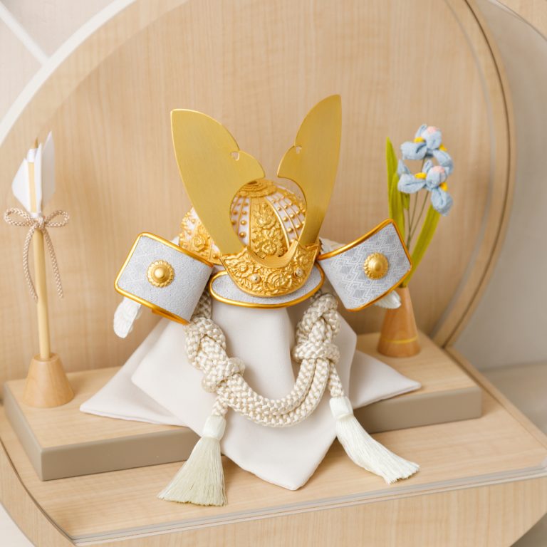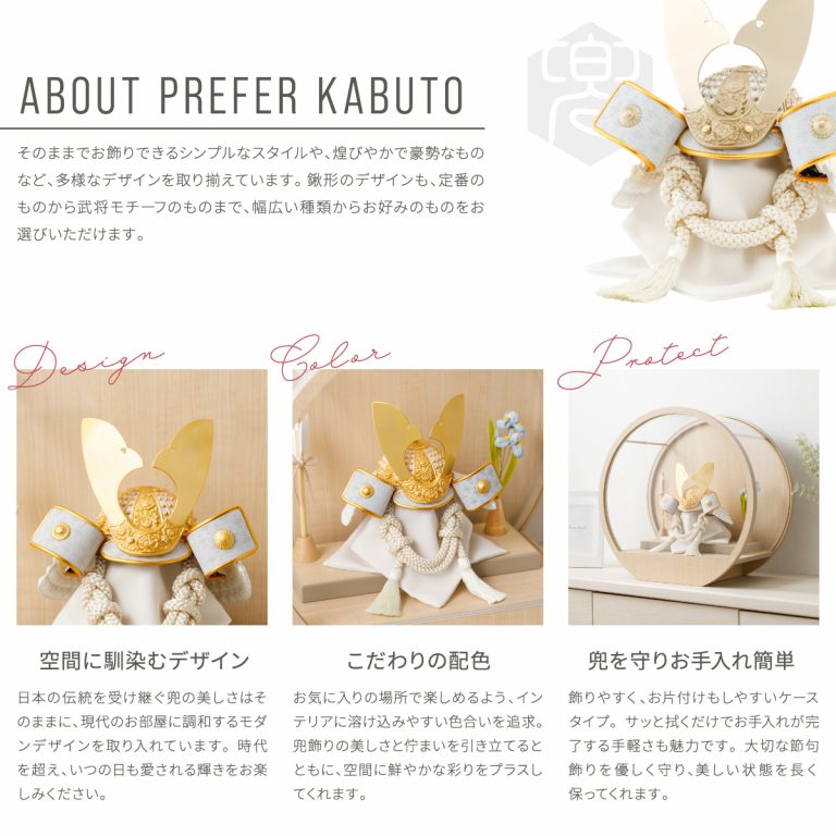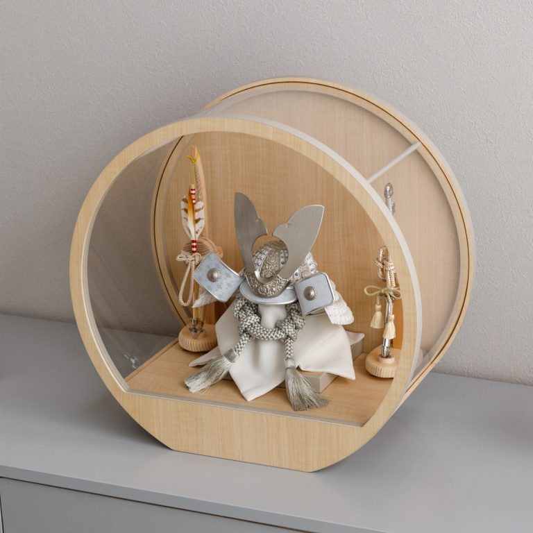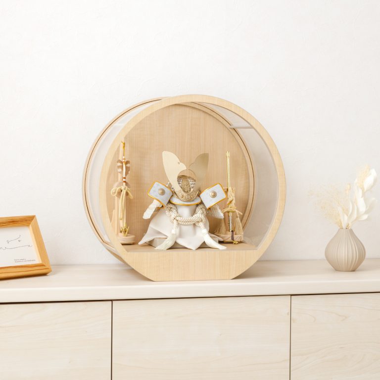 丸みを帯びた鉢と鍬形が、たくましさと優しさを感じさせる兜飾り。おしゃれかつ上品な色合いとコンパクトなサイズ感にこだわりました。伝統とモダンが融合した逸品です。飾り台は、インテリアに溶け込むよう明るめの木目調シートでナチュラルな雰囲気を演出。輪を描く丸型もスタイリッシュでお部屋に華を添えます。五月人形を引き立てる脇飾りはお好みのものをお選びください。ケース飾りはお手入れも簡単です。こどもの日や端午の節句に華を添える、ぷりふあのかっこいい5月人形。初節句のお祝いギフトにいかがでしょうか。