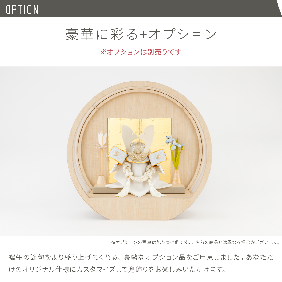 丸みを帯びた鉢と鍬形が、たくましさと優しさを感じさせる兜飾り。おしゃれかつ上品な色合いとコンパクトなサイズ感にこだわりました。伝統とモダンが融合した逸品です。飾り台は、インテリアに溶け込むよう明るめの木目調シートでナチュラルな雰囲気を演出。輪を描く丸型もスタイリッシュでお部屋に華を添えます。五月人形を引き立てる脇飾りはお好みのものをお選びください。ケース飾りはお手入れも簡単です。こどもの日や端午の節句に華を添える、ぷりふあのかっこいい5月人形。初節句のお祝いギフトにいかがでしょうか。