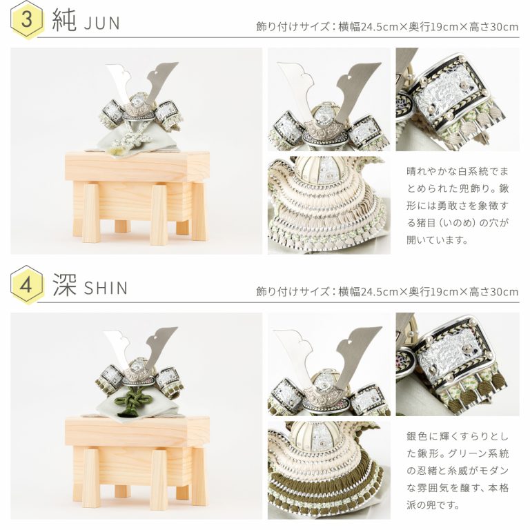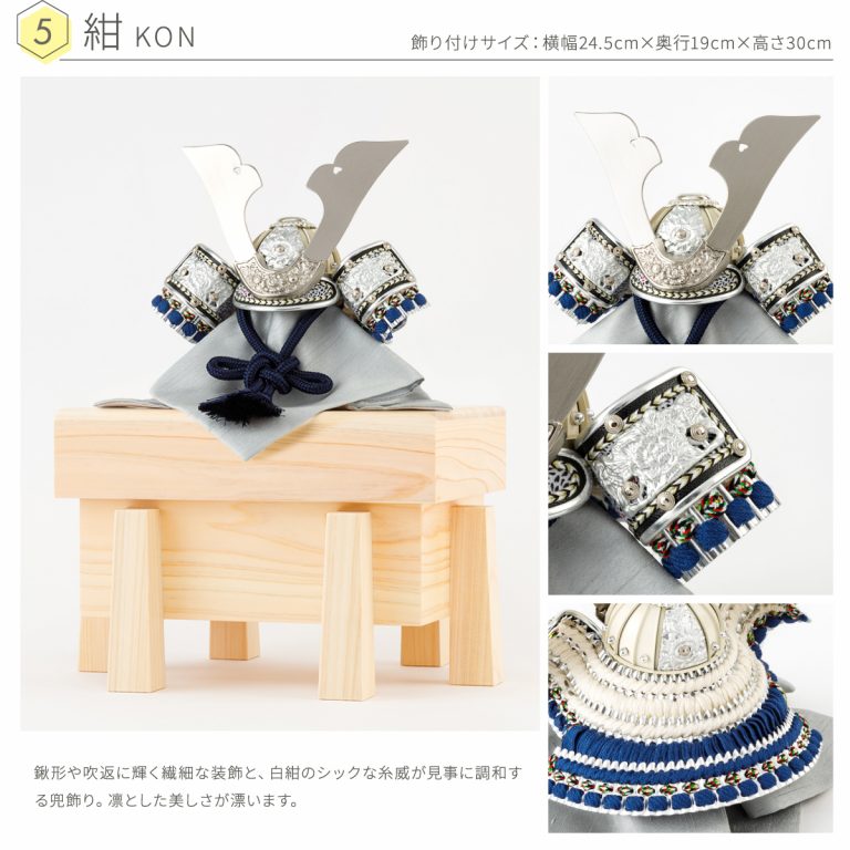 淡い色味を基調とした爽やかさの中にも個性が光るおしゃれな兜飾り。華美すぎない硬派な印象のコンパクトな兜は、大切なお子様の健やかな成長を願う五月人形にぴったりです。白く美しい表情の檜(ひのき)を使用した収納タイプの飾り台は、節句飾りの主役である兜が引き立つよう、模様や柄を敢えて省きました。自然と馴染む檜の素材感がモダンな空間を演出します。