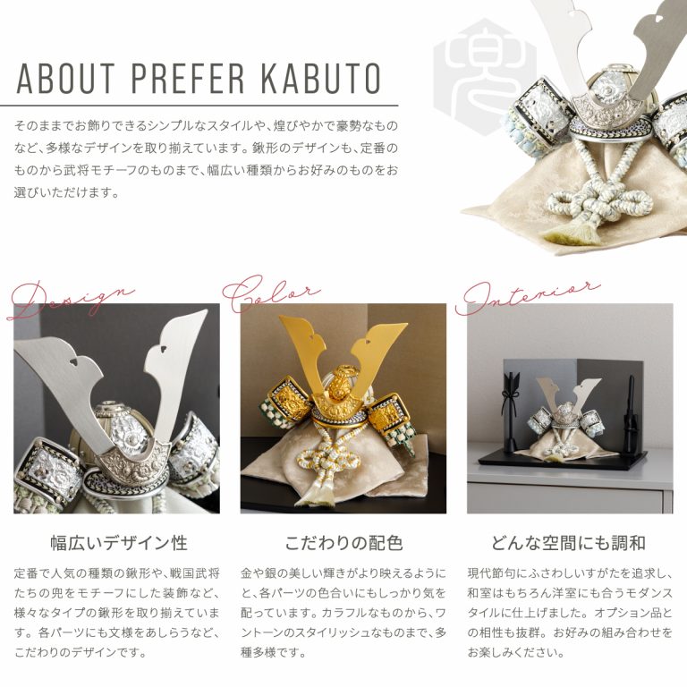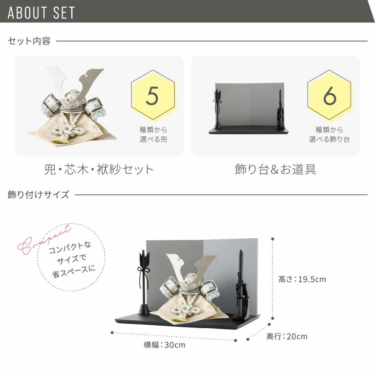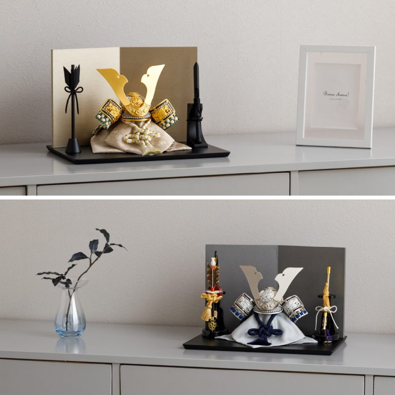 淡い色味を基調とした爽やかさの中にも個性が光る兜飾り。華美すぎない硬派な印象のコンパクトなモダン兜は、大切なお子様の健やかな成長を願う五月人形にぴったりです。マットな黒の平飾り台を合わせ、威厳と品格漂う出で立ちに仕上げました。上品な色合いの二曲屏風が相まって、おしゃれなインテリアのように洗練された雰囲気を醸し出します。脇飾りはお好みに合わせてお選びください。小さいサイズながら目を惹く存在感で、端午の節句に彩りを添えてくれるでしょう。男の子のハレの日を盛り上げる、ぷりふあのかっこいい五月人形。お祝いギフトにもおすすめです。