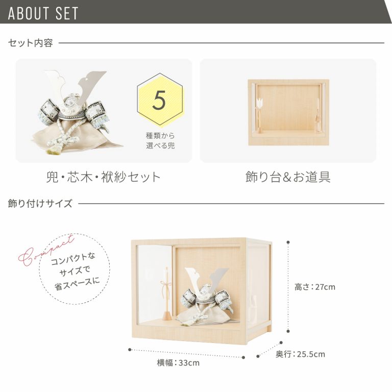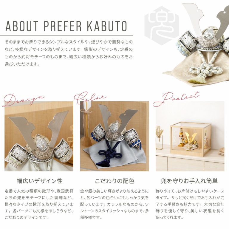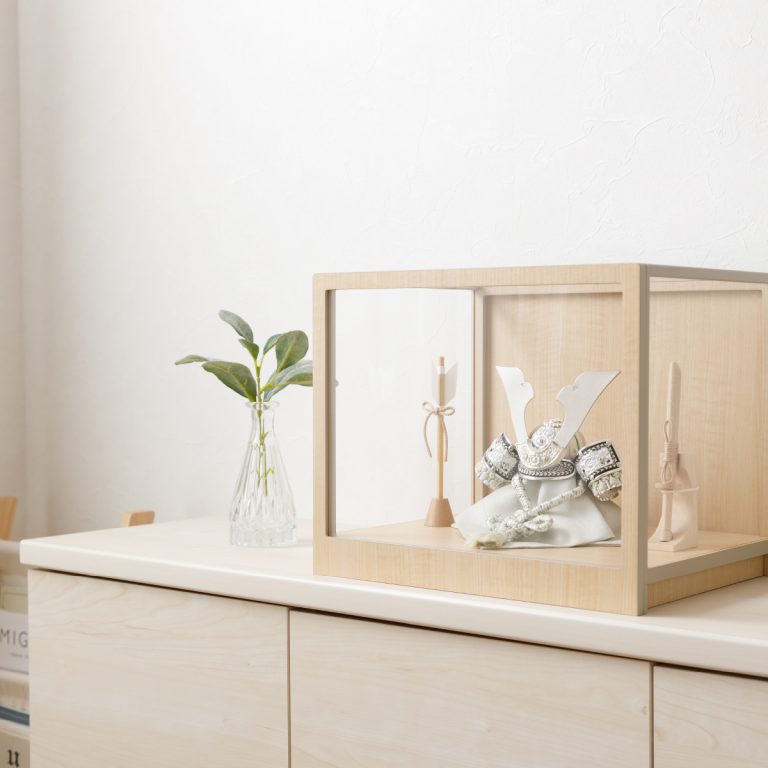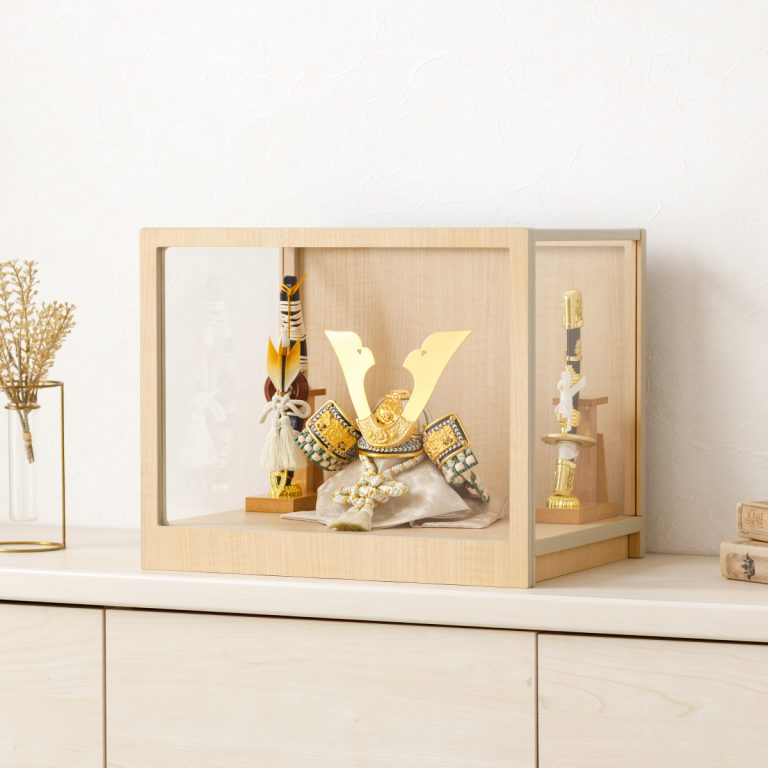 上品な煌めきを放つ、モダンな風合いの兜飾り。細部まで精巧に作られた美しい節句飾りです。日本の伝統を受け継ぐ五月人形を、現代の空間に合うおしゃれでコンパクトなスタイルに仕上げました。兜を彩る飾り台は便利なケースタイプ。シンプルなデザインとナチュラルな色合いは、クラシカル・モダン問わずどんなスタイルのお部屋にも調和します。脇飾りはお好みのものをお選びください。小さいサイズのケース飾りなので場所を取らず、お手入れもかんたんです。端午の節句に欠かせない、ぷりふあのかっこいい五月人形。初節句のお祝いギフトにもおすすめです。