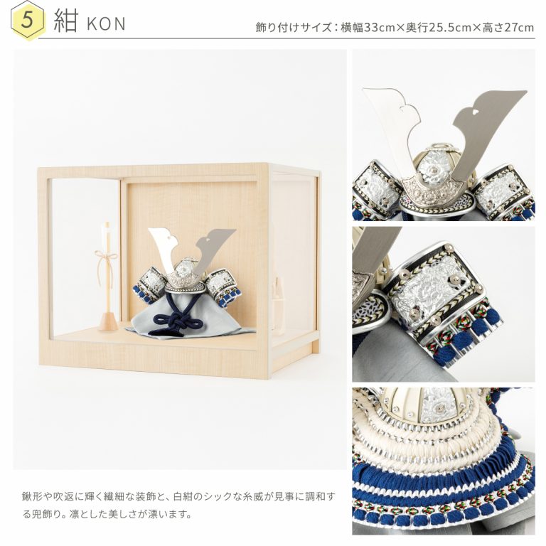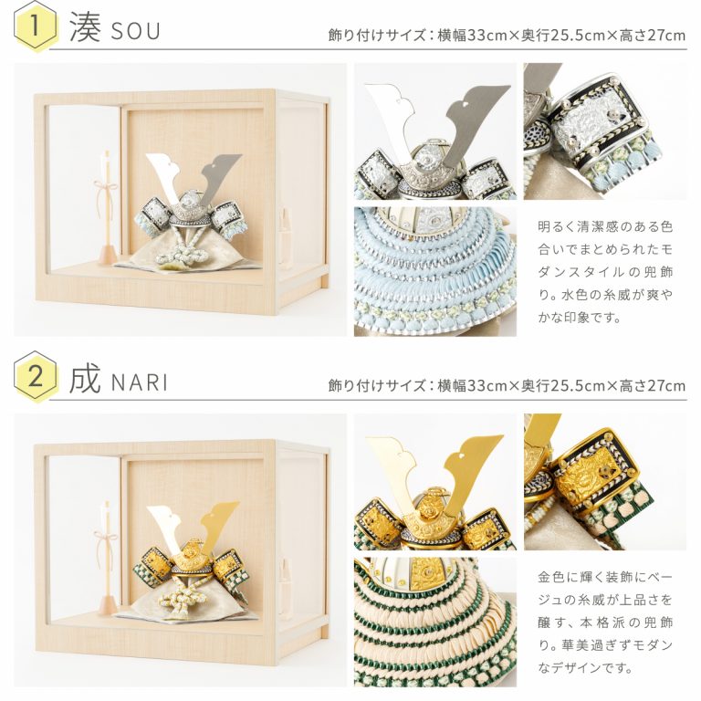 上品な煌めきを放つ、モダンな風合いの兜飾り。細部まで精巧に作られた美しい節句飾りです。日本の伝統を受け継ぐ五月人形を、現代の空間に合うおしゃれでコンパクトなスタイルに仕上げました。兜を彩る飾り台は便利なケースタイプ。シンプルなデザインとナチュラルな色合いは、クラシカル・モダン問わずどんなスタイルのお部屋にも調和します。脇飾りはお好みのものをお選びください。小さいサイズのケース飾りなので場所を取らず、お手入れもかんたんです。端午の節句に欠かせない、ぷりふあのかっこいい五月人形。初節句のお祝いギフトにもおすすめです。