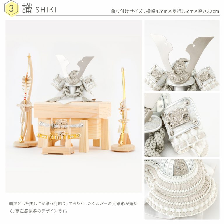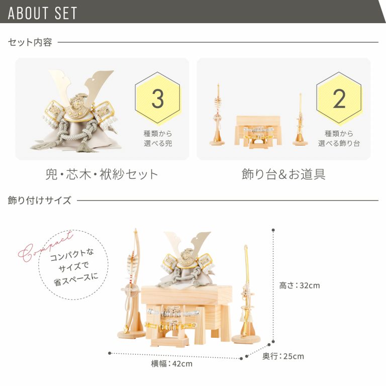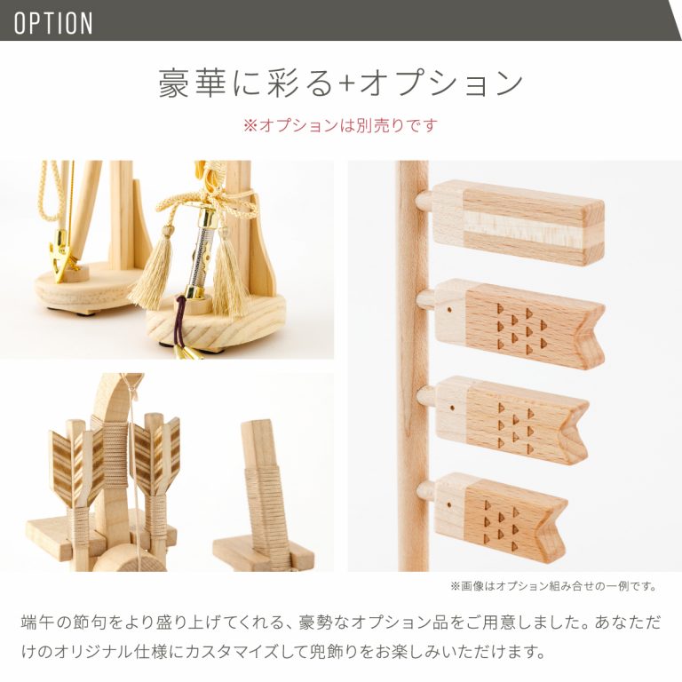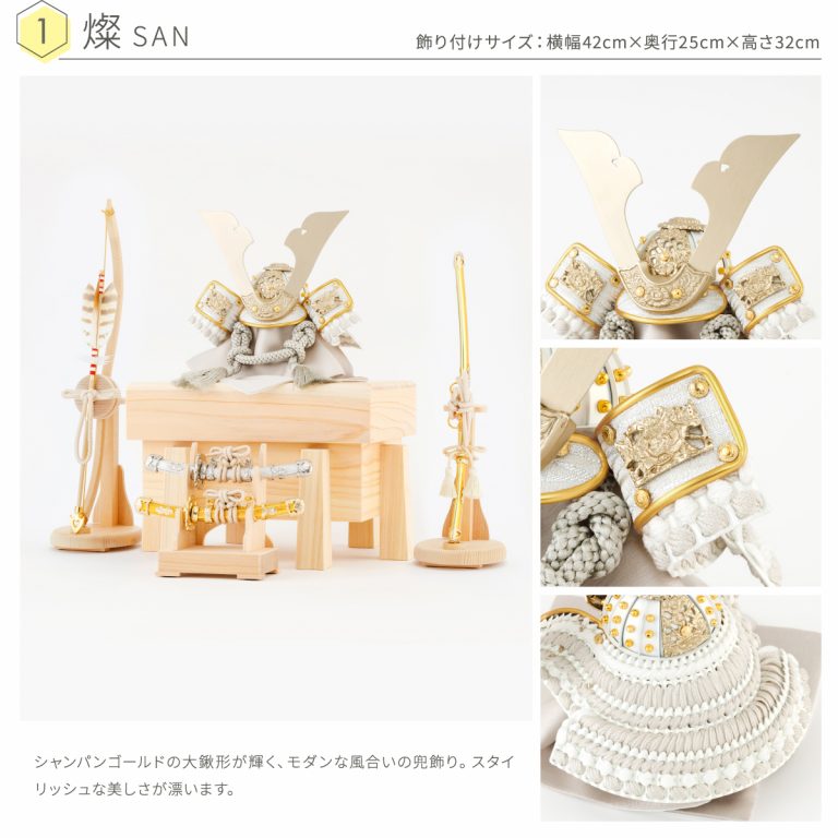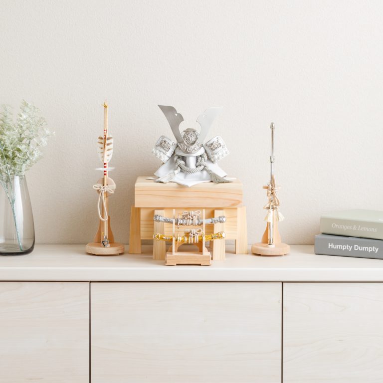 上品な煌めきを放つ兜飾り。細部まで精巧に作られた、どこから眺めても美しい節句飾りです。端午の節句には欠かせない五月人形を、インテリアのように楽しめるおしゃれでコンパクトなスタイルに仕上げました。お子様の特別な日を華やかに彩ってくれるでしょう。弓太刀・二段太刀が付属した飾り台セット。5月人形で飾る弓や太刀には魔除けの意味が込められており、初節句にもおすすめ。飾り台には白く美しい表情の檜(ひのき)を使用し、豪勢ながら素朴で奥ゆかしいデザインです。