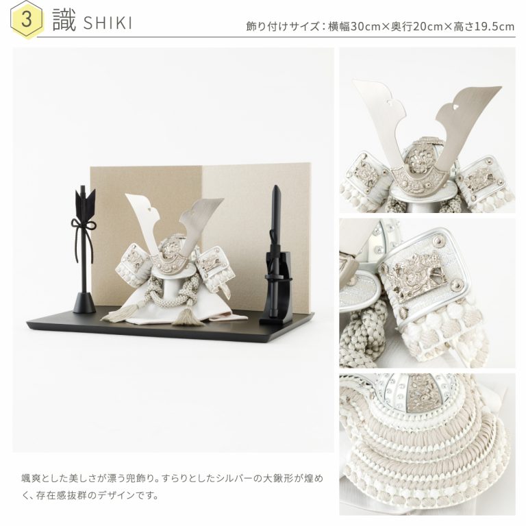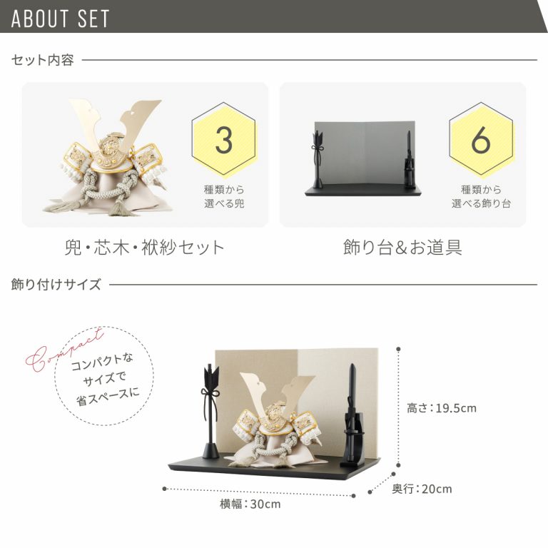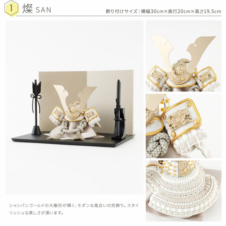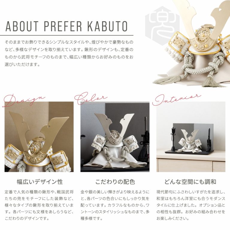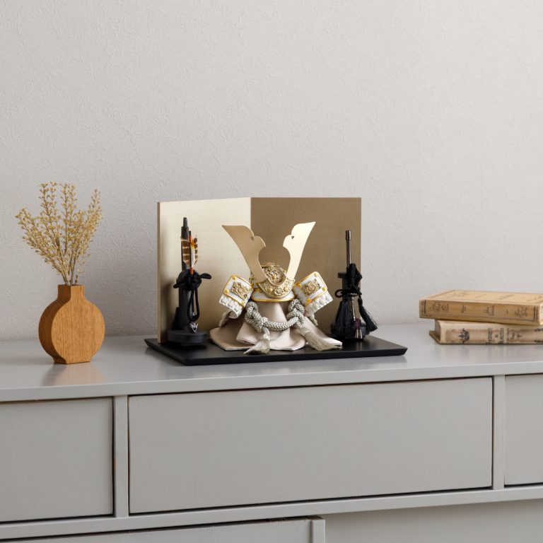 上品な煌めきを放つ、モダンな風合いの兜飾り。日本の伝統を受け継ぐ五月人形を、現代の空間に合うおしゃれでコンパクトなスタイルに仕上げました。マットな黒の平飾り台を合わせることで、その出で立ちからは威厳と品格が漂います。上品な色合いの二曲屏風が相まって、おしゃれなインテリアのように洗練された雰囲気を醸し出します。脇飾りはお好みのものをお選びください。小さいサイズながら目を惹く存在感で、端午の節句に彩りを添えてくれるでしょう。男の子のハレの日を盛り上げる、ぷりふあのかっこいい五月人形。お祝いギフトにもおすすめです。