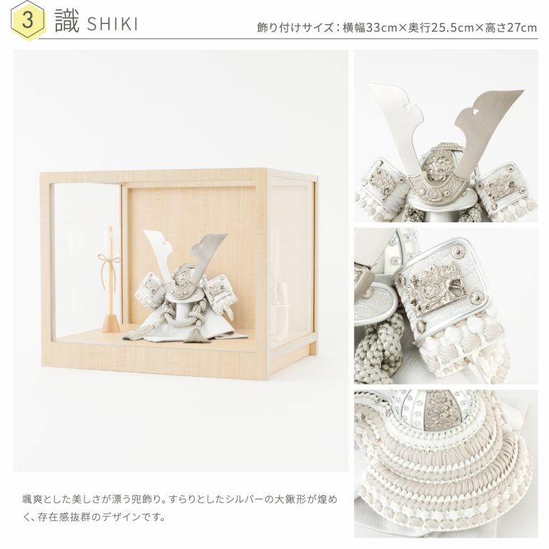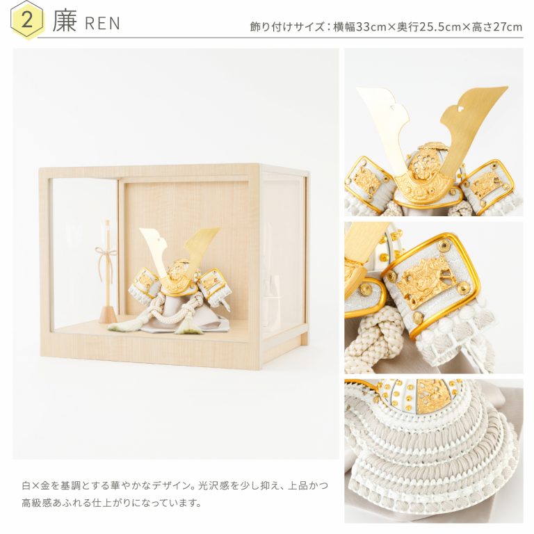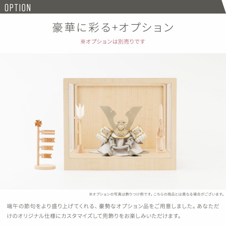 上品な煌めきを放つ、モダンな風合いの兜飾り。日本の伝統を受け継ぐ五月人形を、現代の空間に合うおしゃれでコンパクトなスタイルに仕上げました。兜を彩る飾り台は便利なケースタイプ。シンプルなデザインとナチュラルな色合いは、インテリアのようにどんなお部屋にも調和します。脇飾りはお好みのものをお選びください。小さいサイズのケース飾りは場所を取らず、お手入れもかんたん。こどもの日や端午の節句に欠かせない、ぷりふあのかっこいい五月人形。初節句のお祝いギフトにもおすすめです。