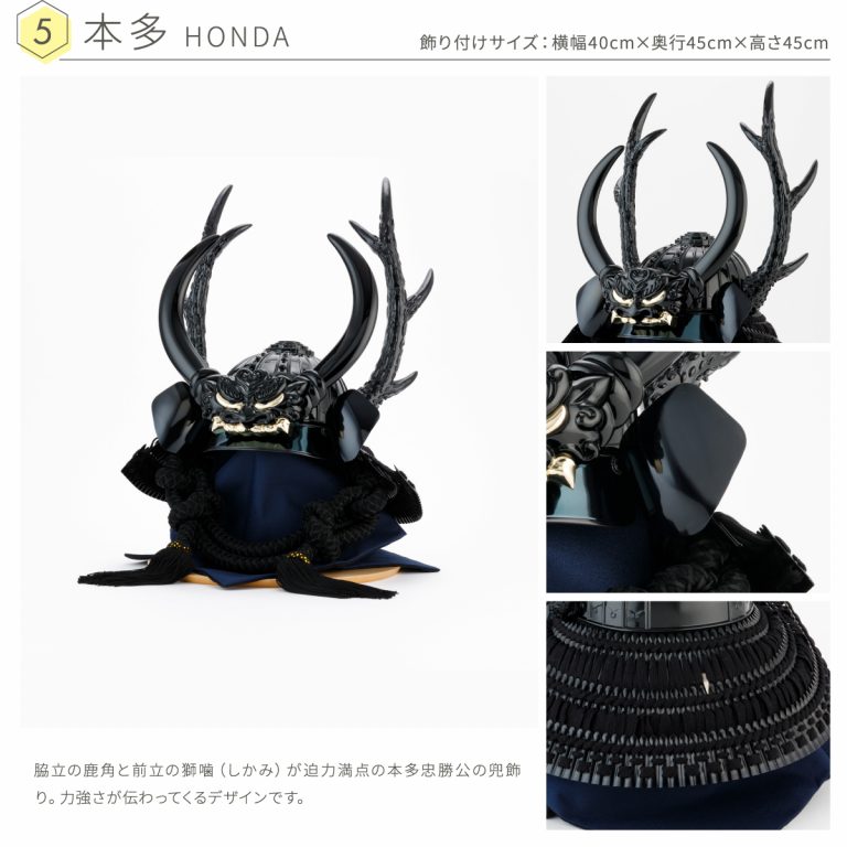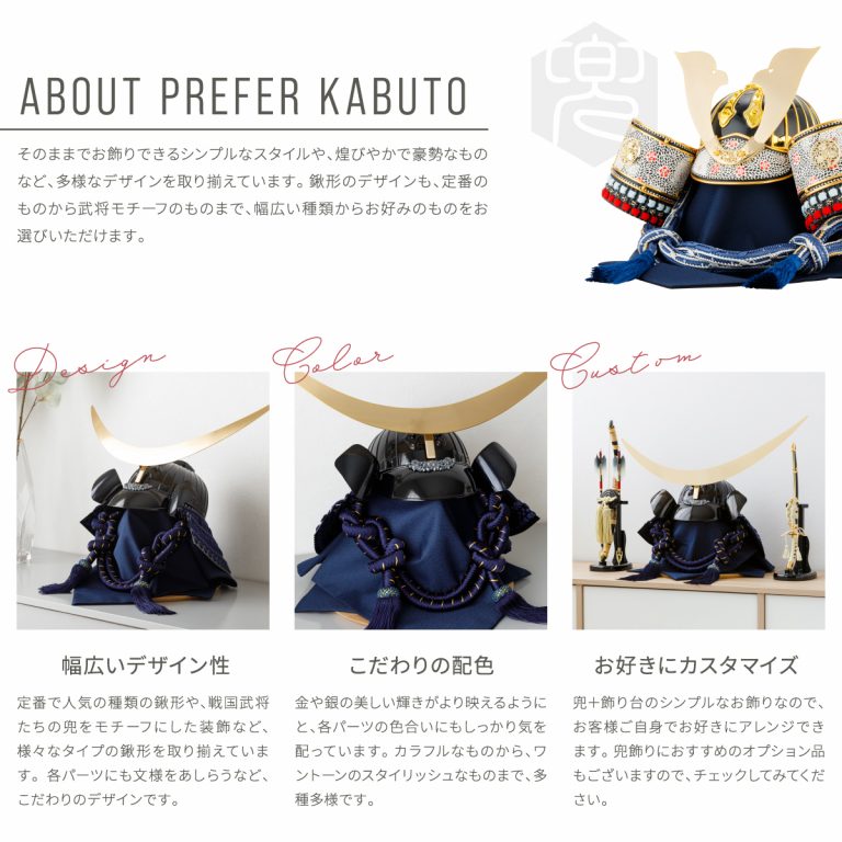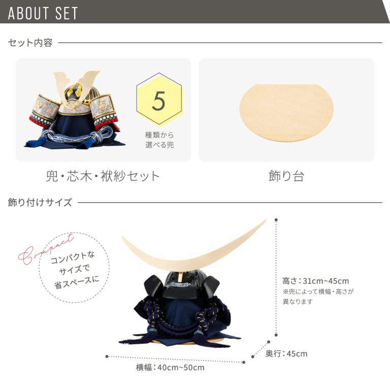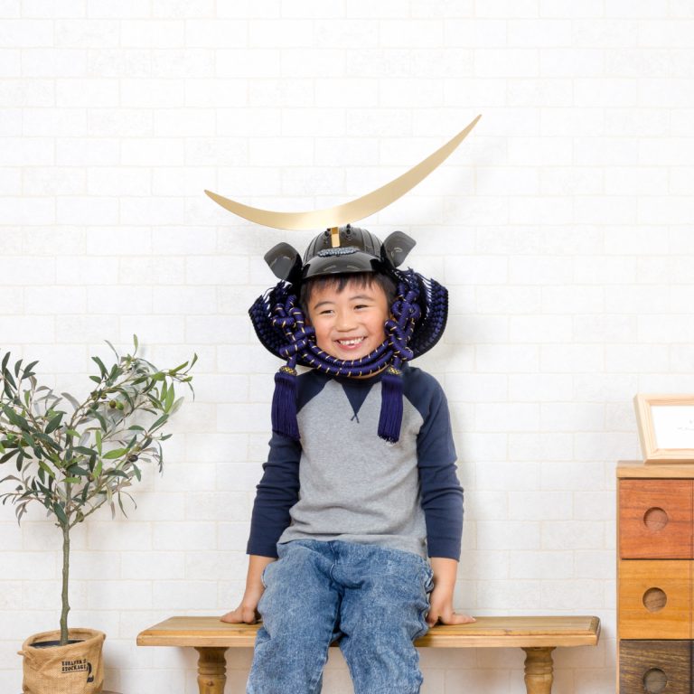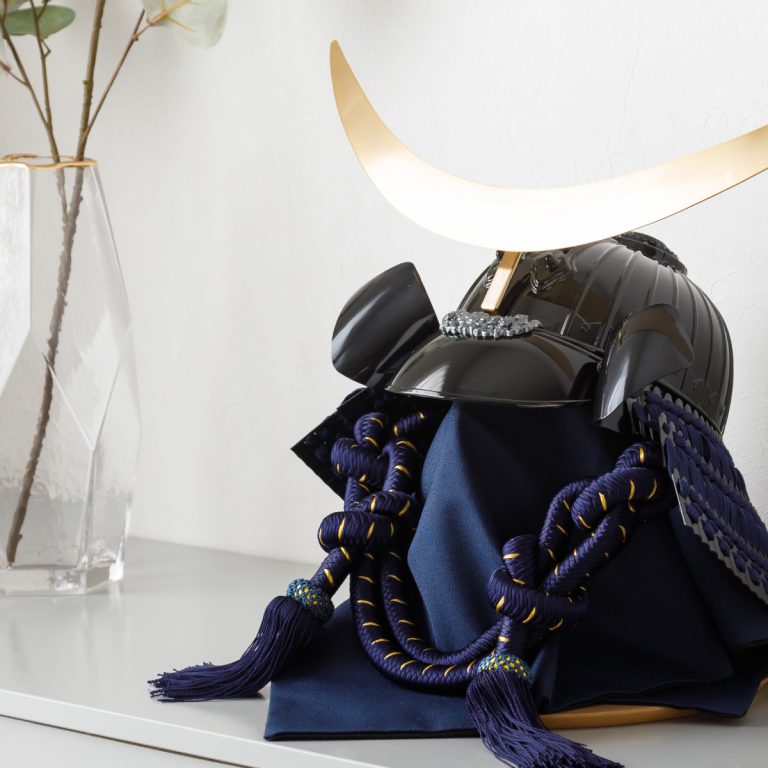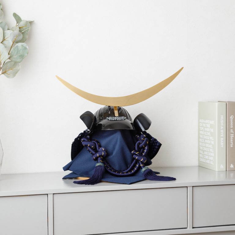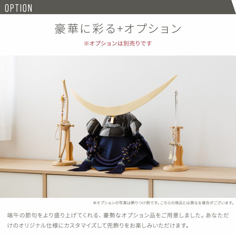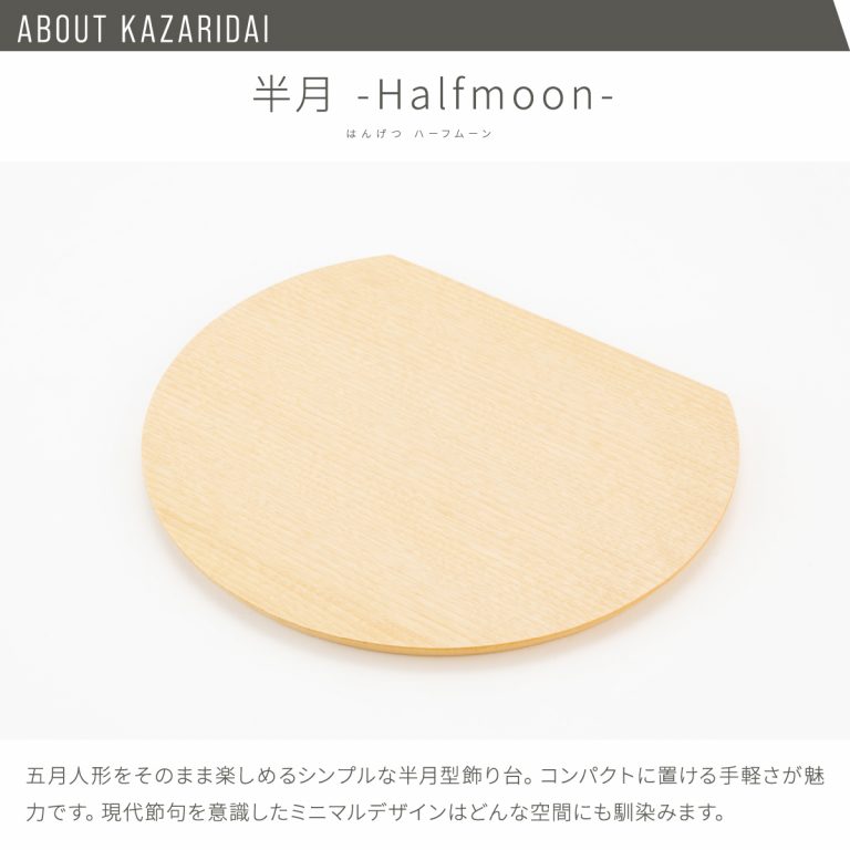 上杉謙信や伊達政宗など、名だたる武将になりきれる着用タイプの兜飾り。お部屋に飾って節句飾りやインテリアとして楽しんだり、実際にかぶって記念撮影したりするのもオススメ。端午の節句を豪華に彩る本格派の兜です。半月を連想させるロマンチックな飾り台は、バーチを使用した日本家具産業会認定の国産品。シンプルですっきりとしたフォルムなので5月人形を存分に楽しめます。