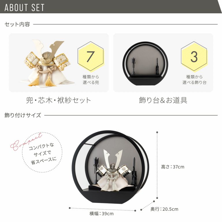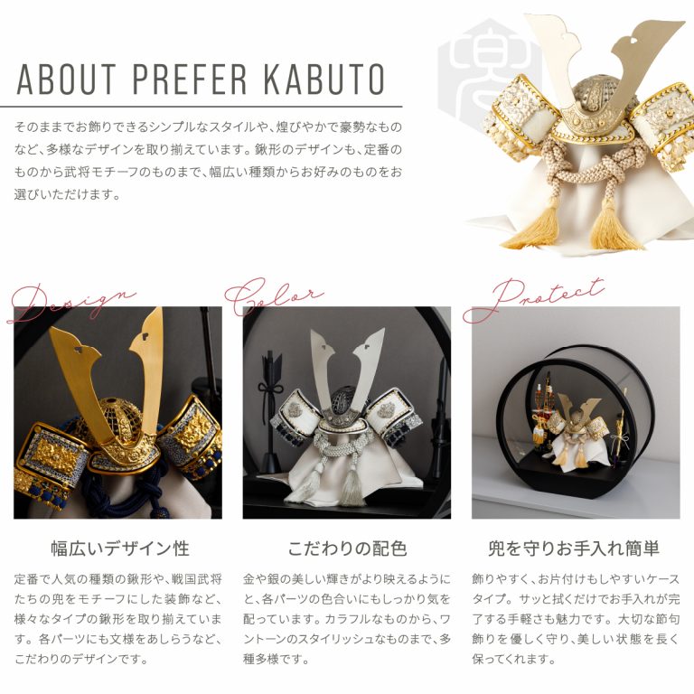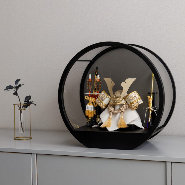 煌々とした輝きを放つコンパクトで美しいインテリア兜飾り。端午の節句にぴったりな金銀の輝きに、力強さと高貴さを感じる絢爛豪華な節句飾りです。飾り台はお手入れ簡単なケースタイプ。マットに仕上げた黒が五月人形の輝きを引き立てます。優雅な曲線を描くフォルムは、クラシカル・モダン問わずあらゆるお部屋に調和。脇飾りはお好みに合わせてお選びください。省スペースで楽しめるおしゃれなケース飾りが、端午の節句にいっそう華を添えてくれるでしょう。かっこいいぷりふあの五月人形は、初節句のお祝いやギフトにもおすすめです。